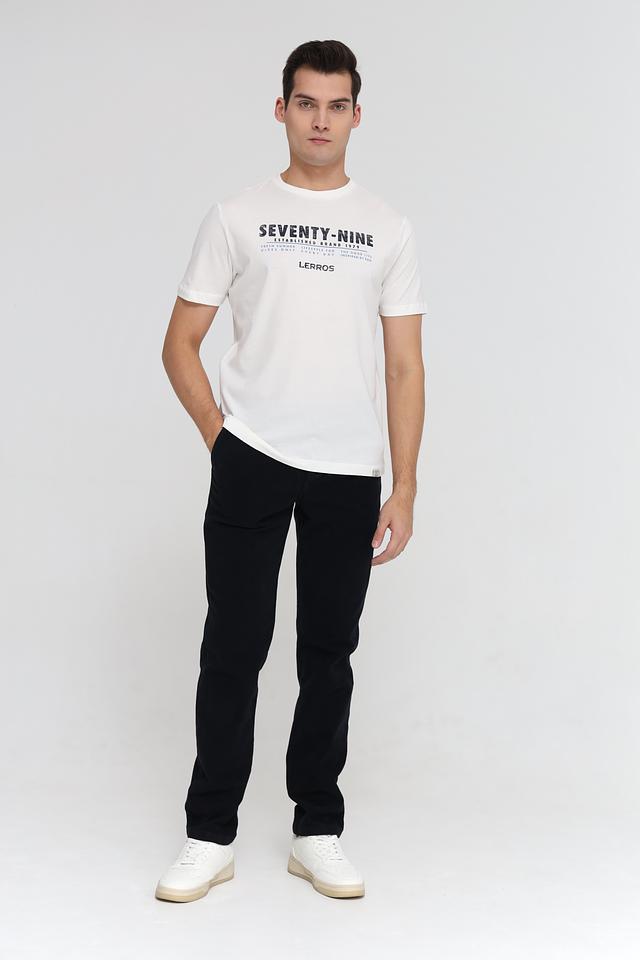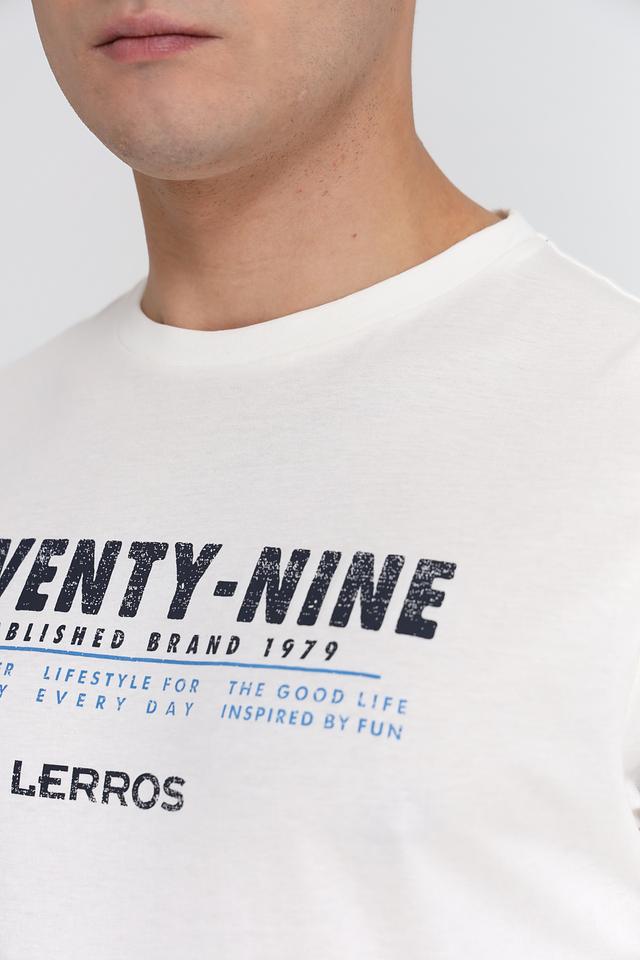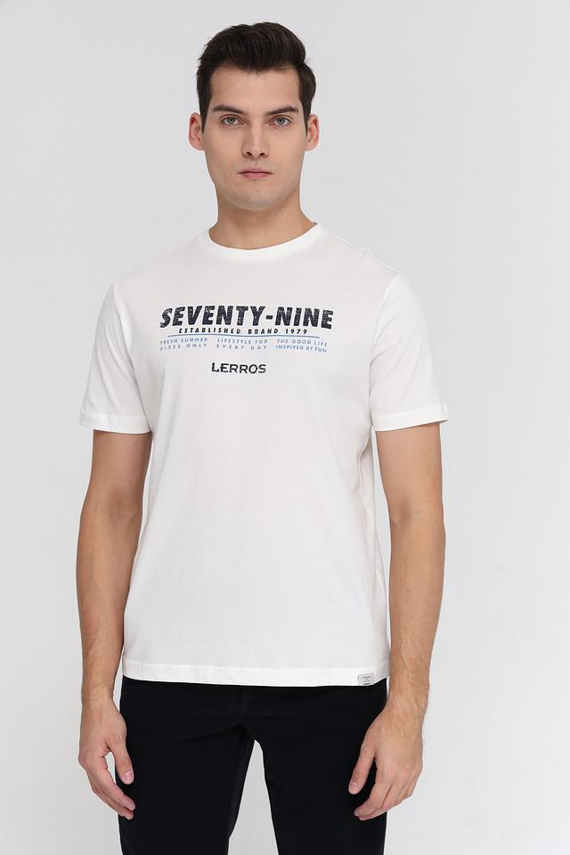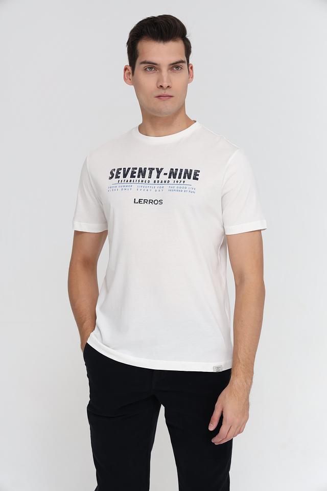 Основным элементом дизайна является яркий принт с надписью "Seventy-Nine" и логотипом бренда Lerros. Принт выполнен в чёрном цвете, что создаёт контрастный и привлекательный вид. Футболка имеет классический прямой крой, короткие рукава и круглый вырез горловины.