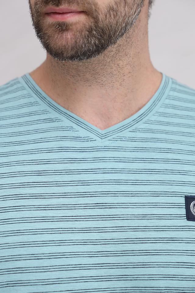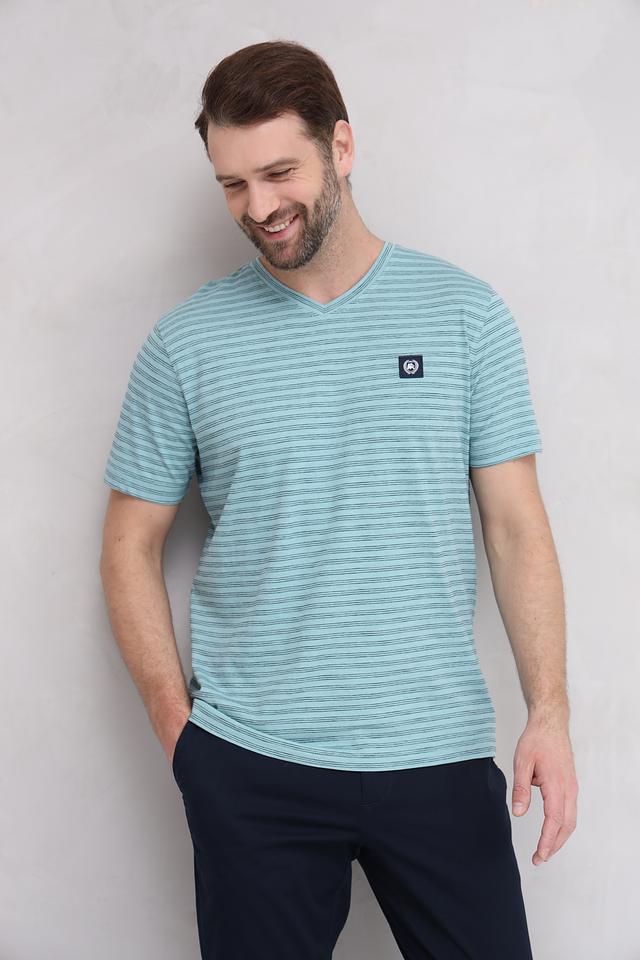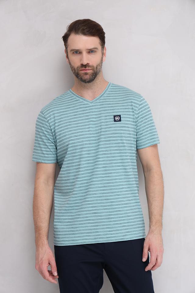 Мужская футболка Lerros бирюзового цвета с V-образным вырезом и полосатым рисунком. Изготовлена из 100% хлопка, обеспечивающего комфорт и воздухопроницаемость. Стильный и универсальный вариант для повседневного образа. Состав: хлопок 100%