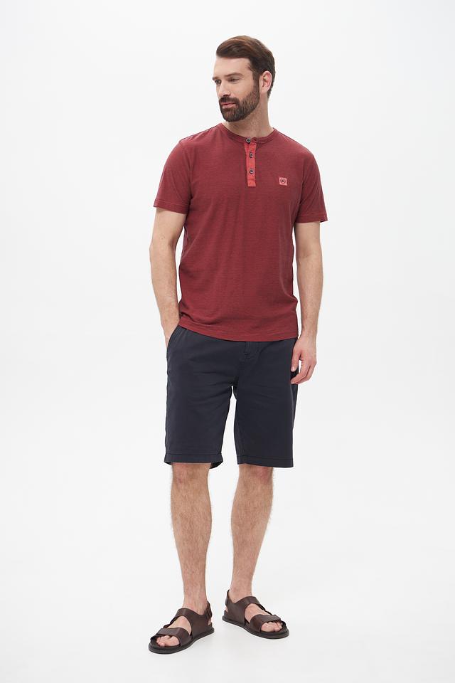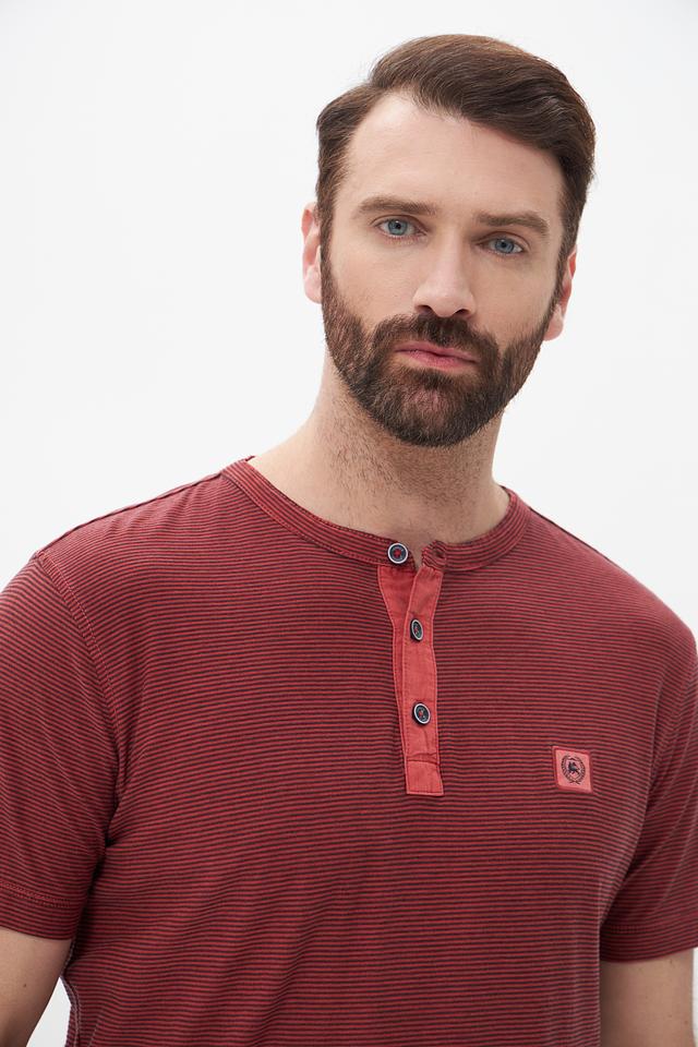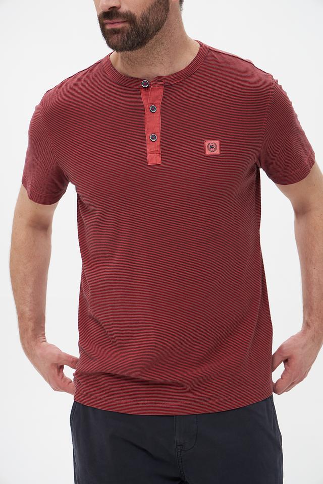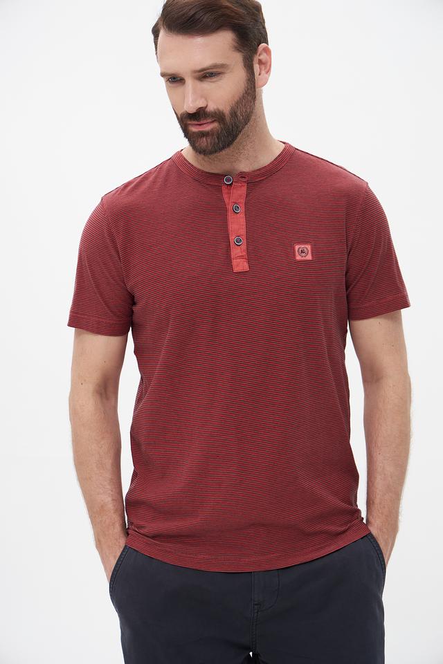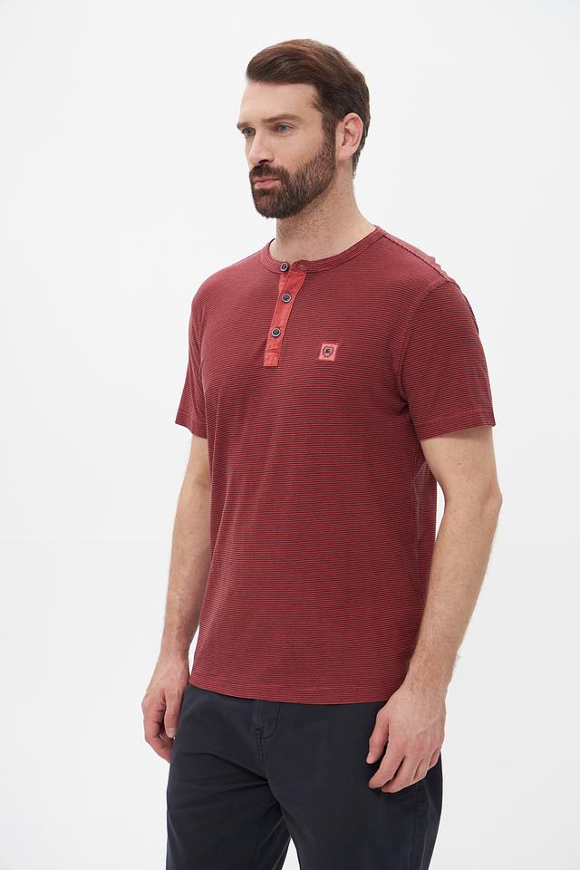 Мужская футболка Lerros бордового цвета с коротким рукавом и полосатым рисунком. Изготовлена из 100% хлопка, обеспечивающего комфорт и воздухопроницаемость. Удобная модель с планкой на пуговицах. Состав: хлопок 100%