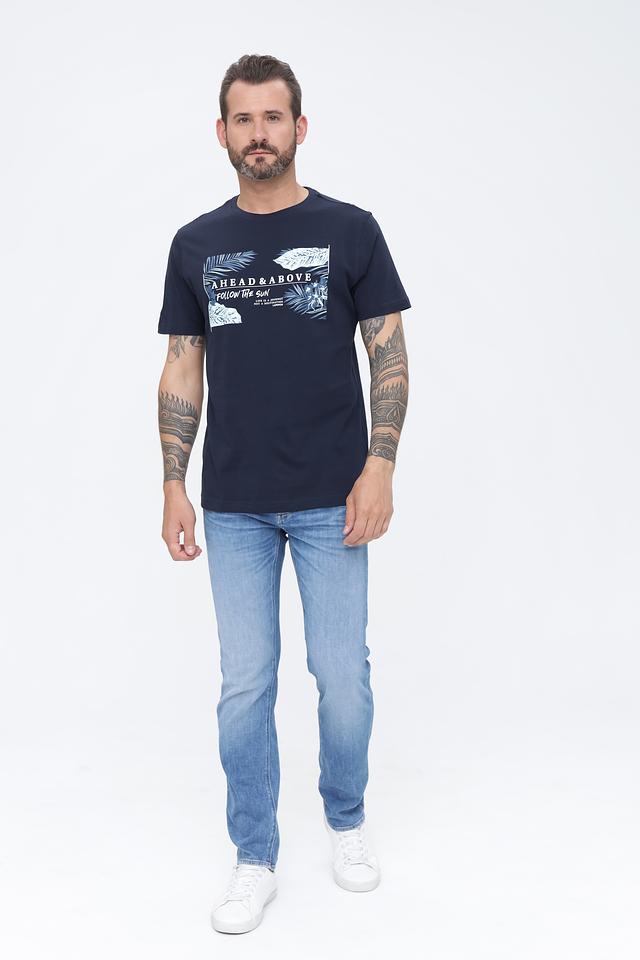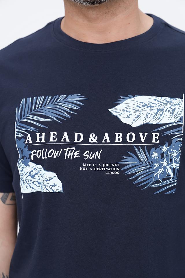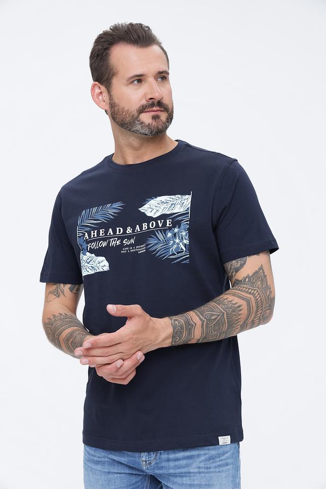 Футболка имеет классический прямой крой и короткий рукав. Главная особенность модели – стильный принт с изображением пальм и надписью "AHEAD & ABOVE FOLLOW THE SUN". Принт выполнен в сине-белой гамме, что гармонично сочетается с основным цветом футболки.