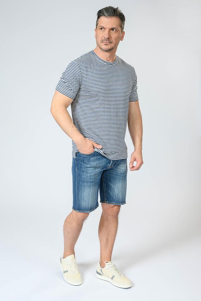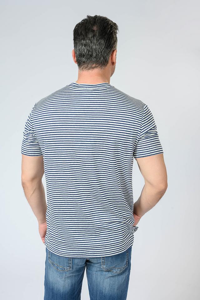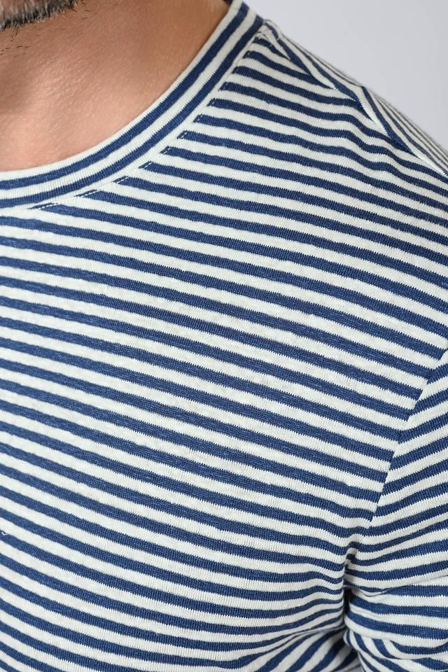 Мужская футболка Liu-Jo синего и белого цвета в классическую полоску. Изготовлена из натурального льна с добавлением эластана для комфорта и лучшей посадки. Стильный и универсальный вариант для повседневного образа. Состав: лен 95%, эластан 5%