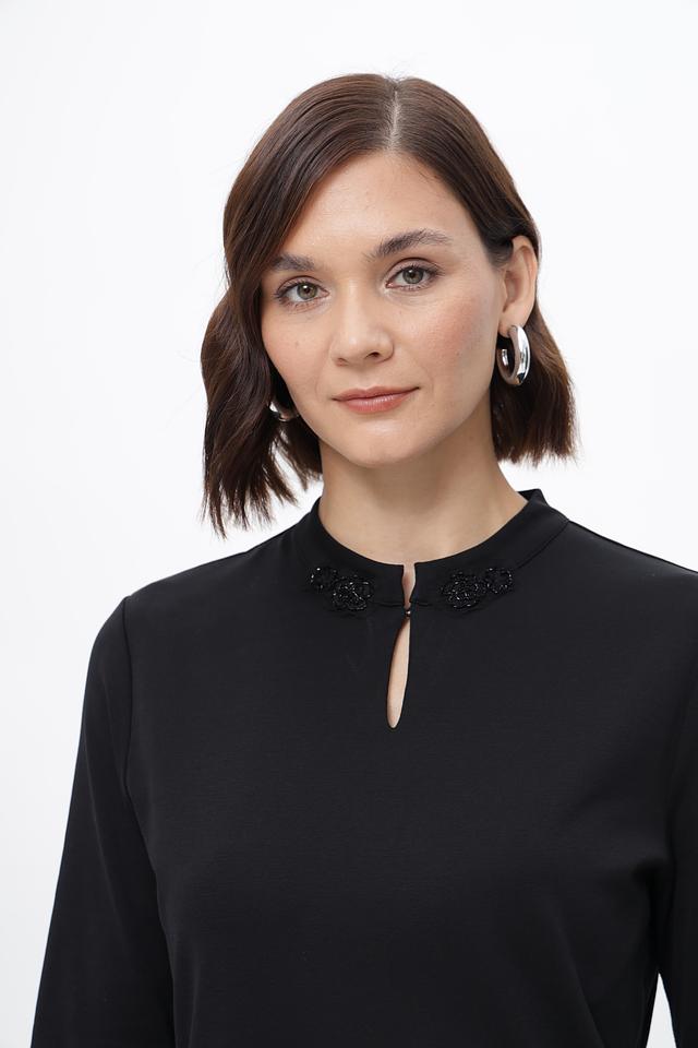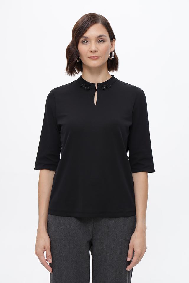 Особенностью данной модели является декоративный вырез на горловине, украшенный небольшими элементами. Вырез придает образу изысканность и оригинальность. Блуза имеет укороченный рукав, что делает ее подходящей для теплой погоды.