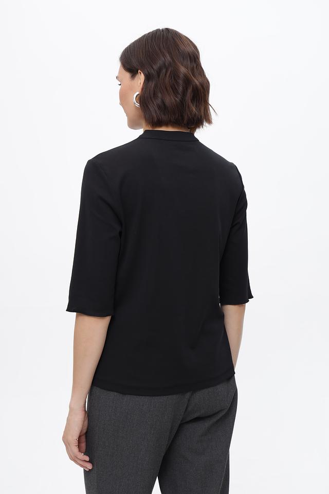 Чёрная блуза Marc Cain с декоративным вырезом на горловине. Изготовлена из мягкого хлопка с добавлением эластана для комфорта и хорошей посадки. Идеально подходит для создания элегантного образа. Состав: хлопок 95%, эластан 5%