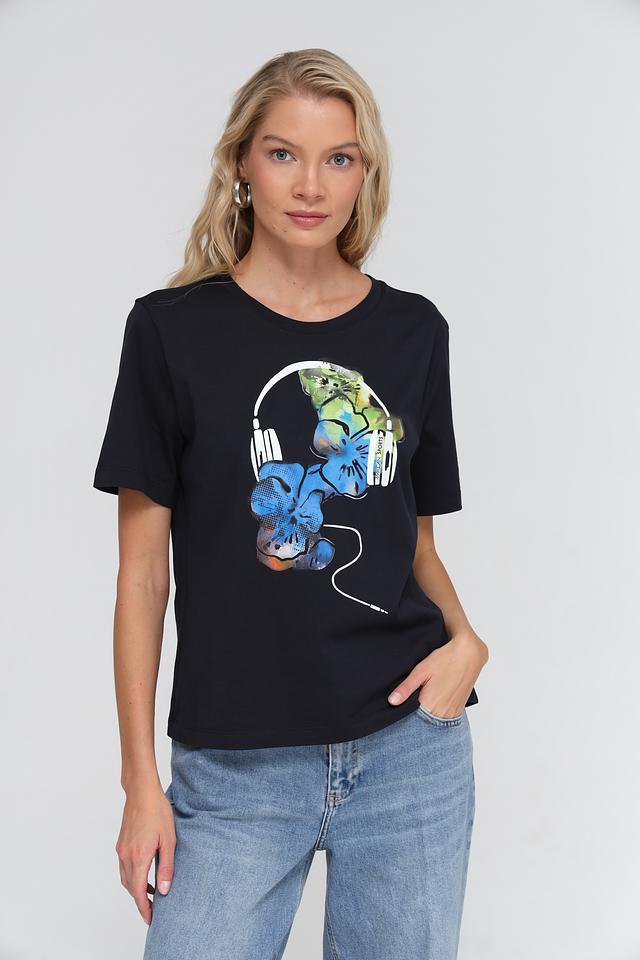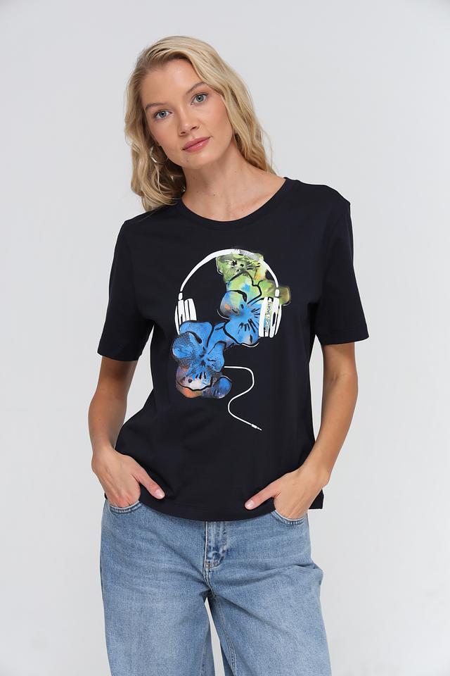 Чёрная футболка Marc Cain из 100% хлопка с ярким принтом в виде наушников и абстрактного рисунка. Комфортный крой и натуральный материал обеспечивают удобство в повседневной носке. Состав: хлопок 100%