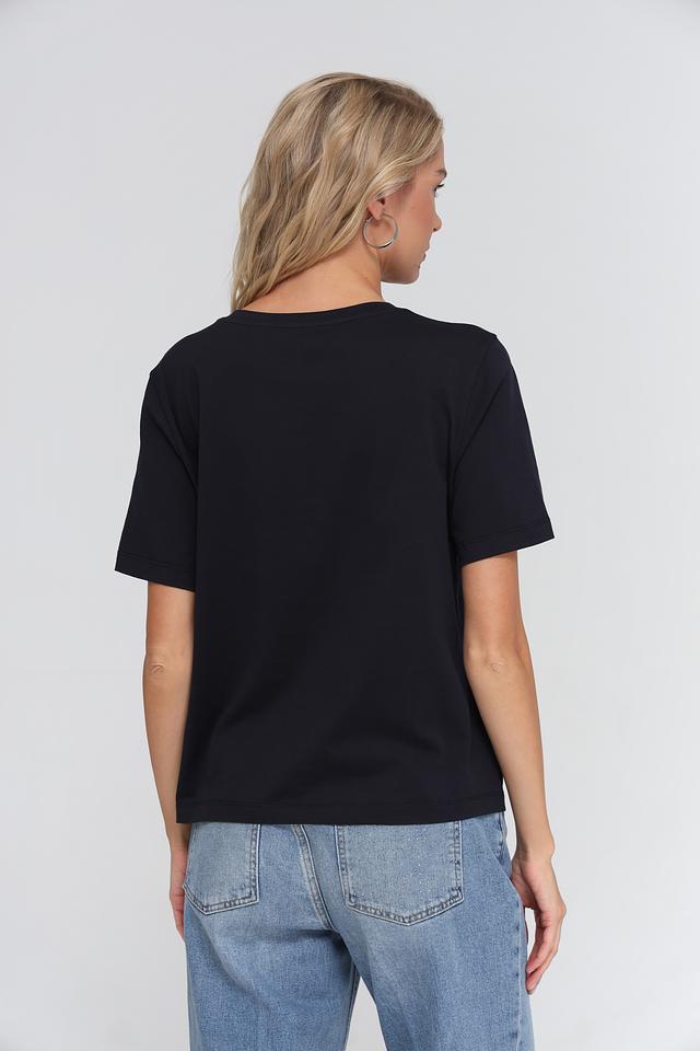 Футболка имеет классический прямой крой и круглый вырез горловины. Она прекрасно сочетается с джинсами, шортами или юбками, создавая непринужденный и модный образ. Идеальный выбор для повседневной носки и активного отдыха.