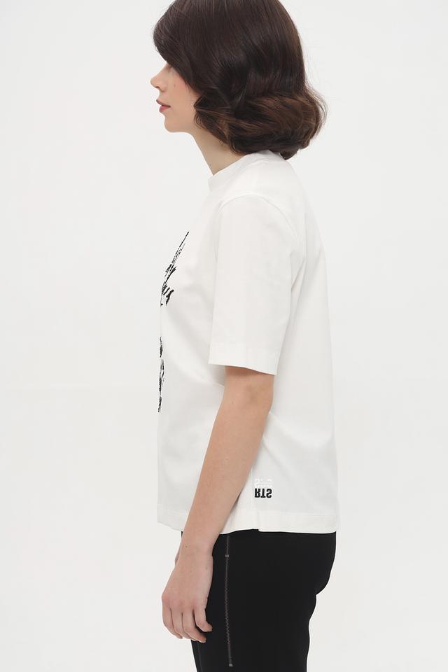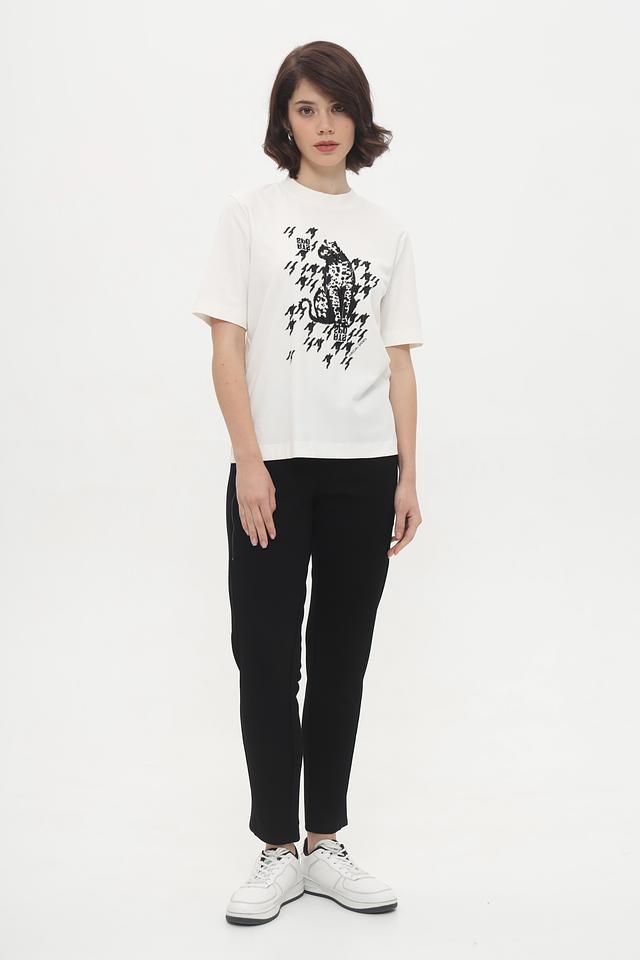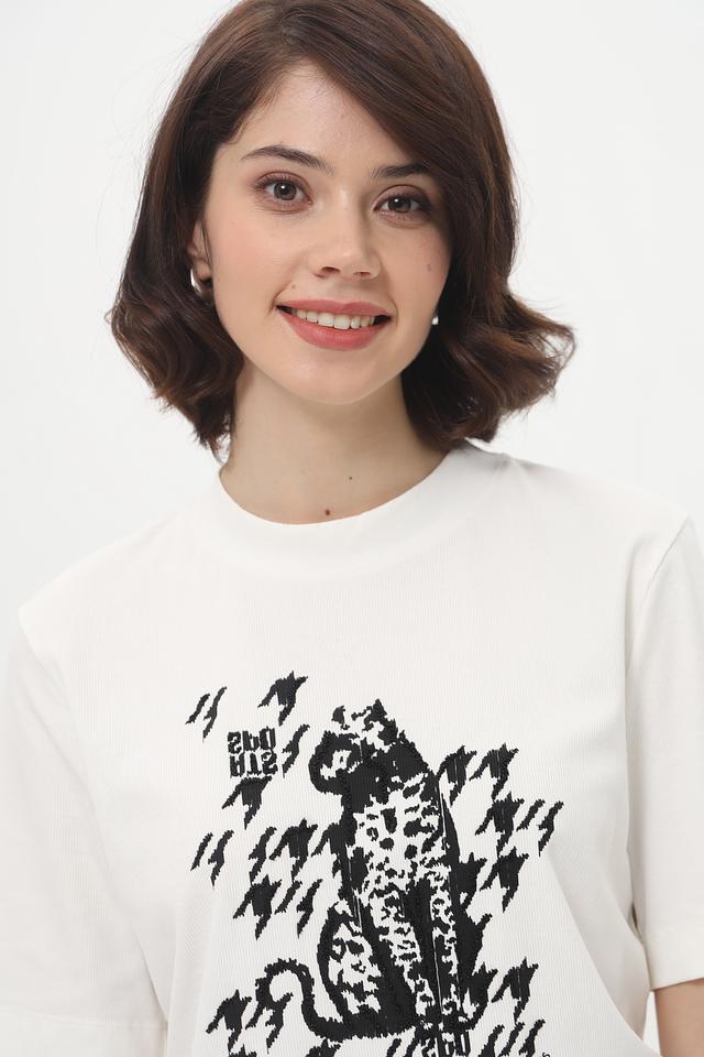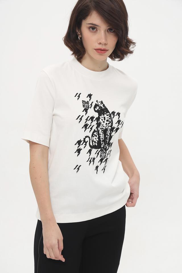 Основной цвет футболки – белый, что делает ее универсальной и легко сочетаемой с другими элементами одежды. Главная особенность модели – яркий и запоминающийся принт с изображением леопарда и абстрактными надписями.