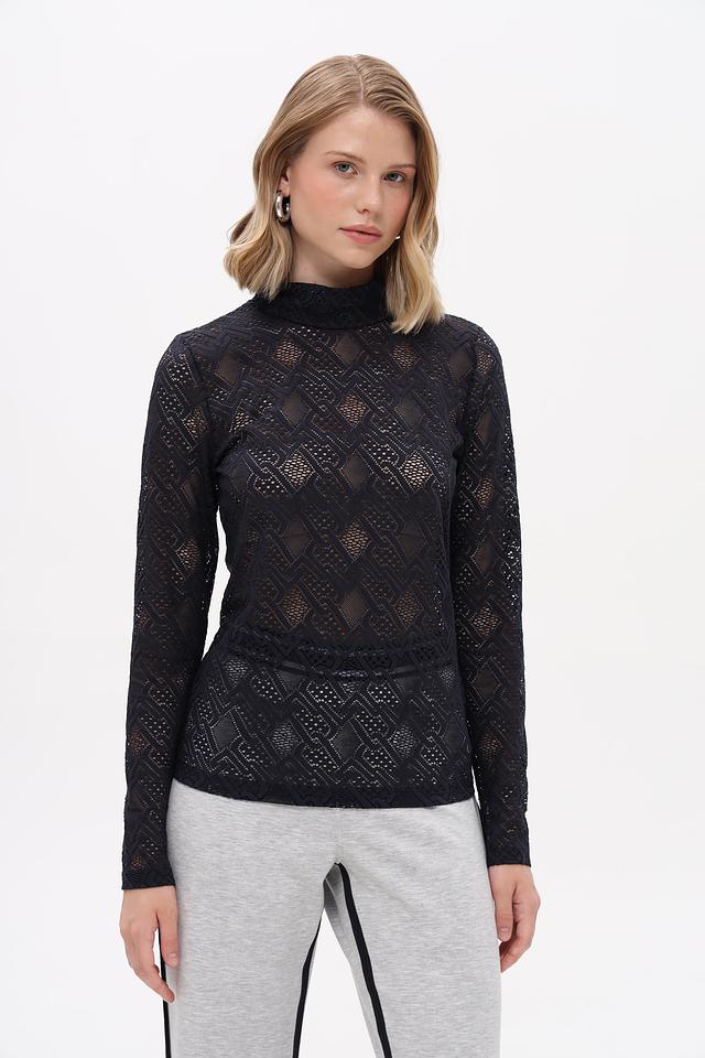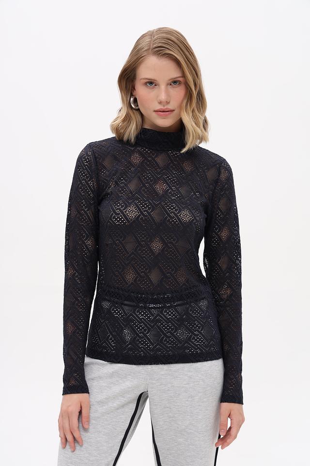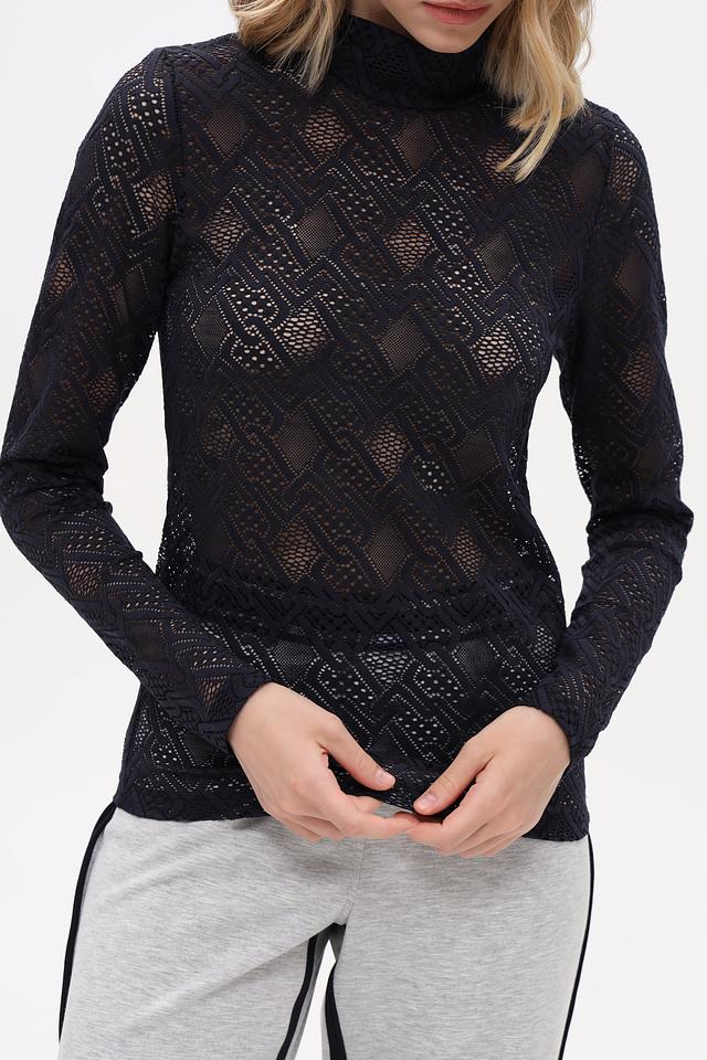 Чёрная футболка с длинным рукавом от Marc Cain, выполненная из полупрозрачной ткани с геометрическим узором. Состав: 93% полиамид, 7% эластан. Состав: полиамид 93%, эластан 7%