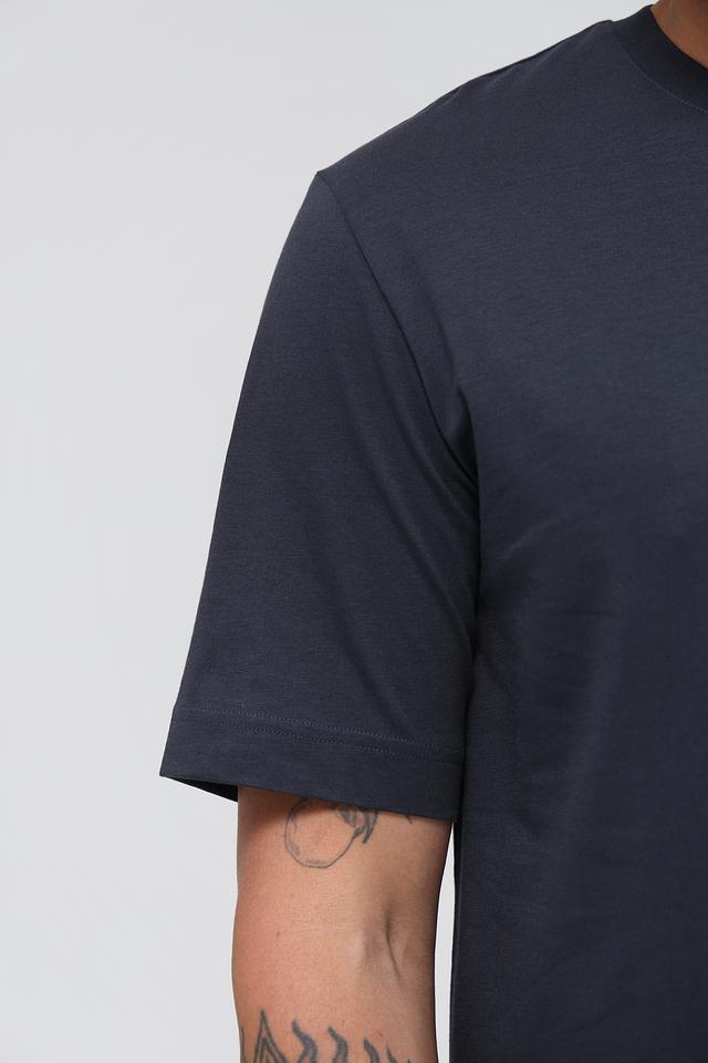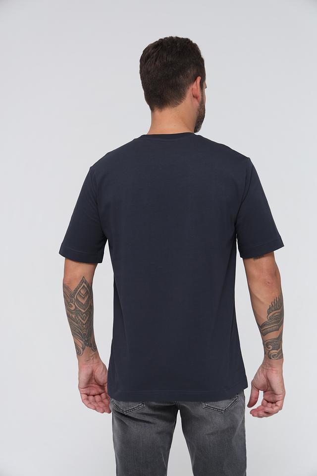 Футболка имеет прямой силуэт и короткие рукава. На груди расположен небольшой логотип бренда, выполненный в тон ткани, что придает модели лаконичный и стильный вид. Цвет футболки – насыщенный темно-синий, который легко сочетается с различными элементами гардероба.