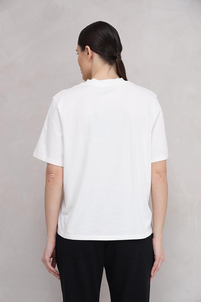 Футболка имеет классический прямой крой, который подходит для любой фигуры. На груди расположен круглый логотип бренда, выполненный в чёрном цвете, что придает ей узнаваемый и стильный вид.