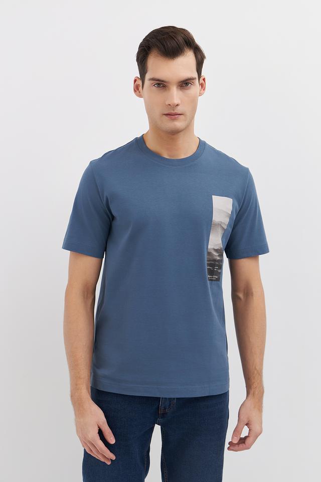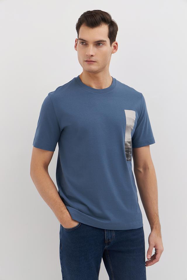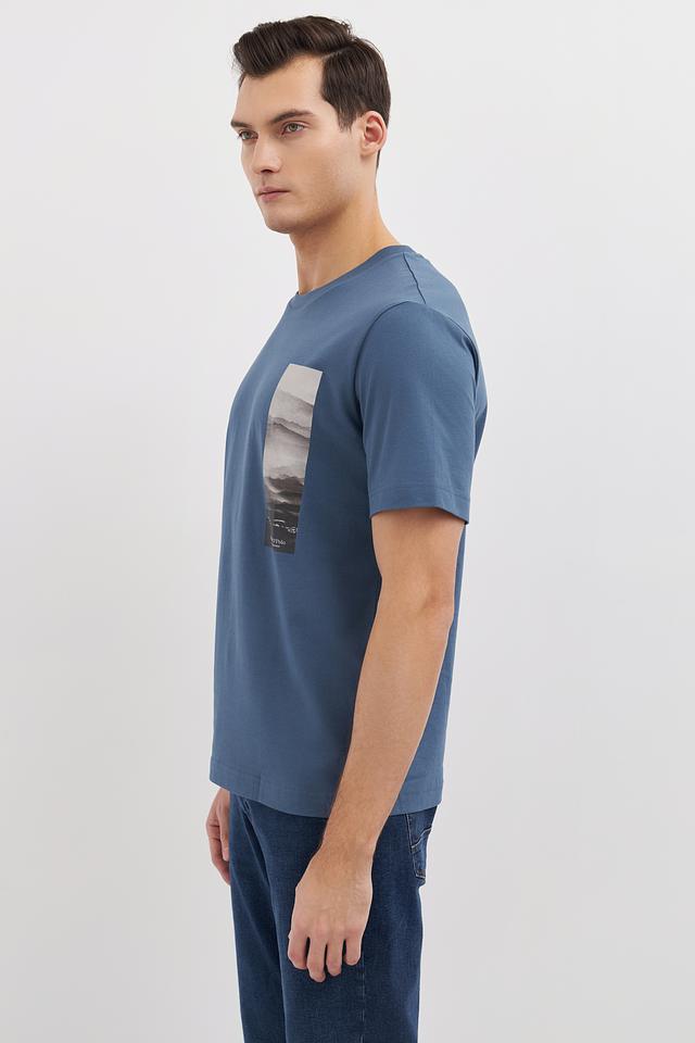 Футболка имеет классический прямой крой, который подходит для любого типа фигуры. Голубой цвет и оригинальный принт на груди придают ей современный и стильный вид. Принт выполнен в виде прямоугольника с изображением горного пейзажа.