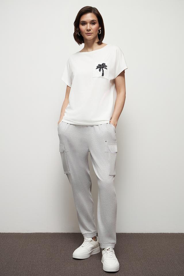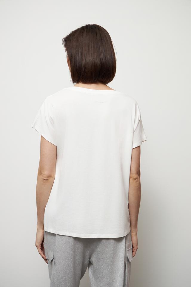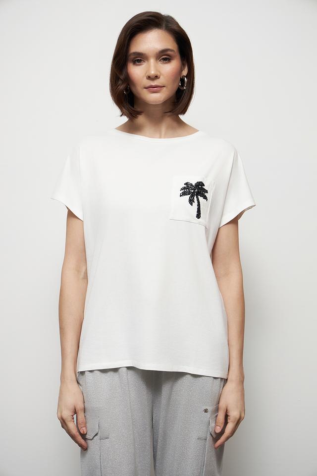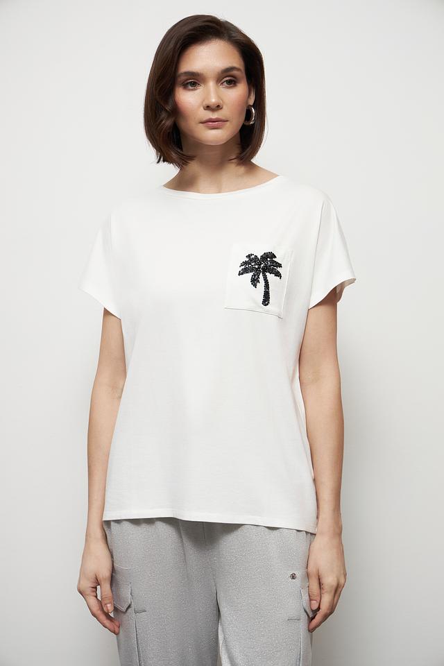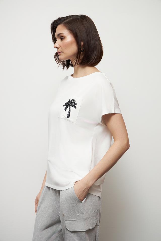 Белая футболка Miss Lagotte с принтом в виде пальмы на нагрудном кармане — стильное и комфортное решение для повседневного образа. Изготовлена из мягкого хлопка с добавлением модала и эластана, обеспечивающего удобную посадку. Состав: хлопок 47%, модал 47%, эластан 6%