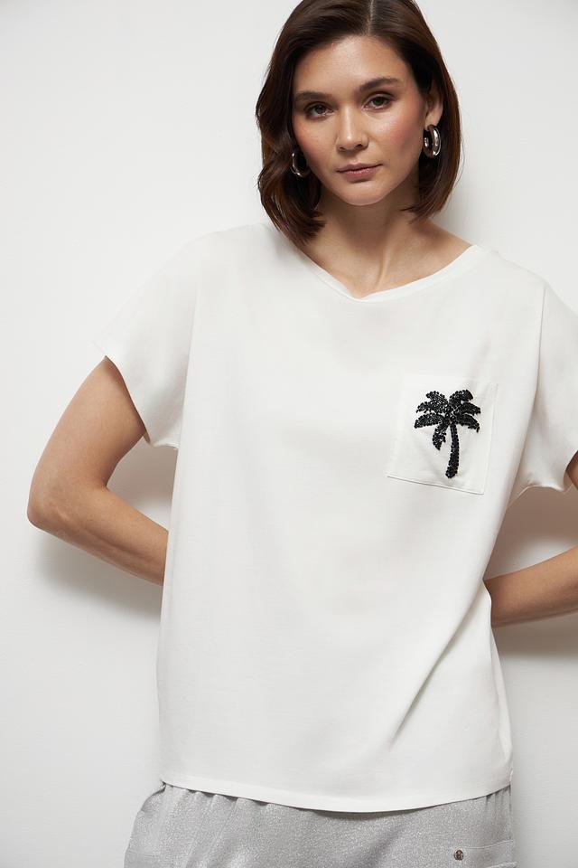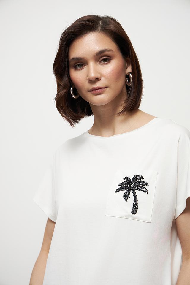 Особенностью данной модели является декоративный нагрудный карман, украшенный принтом в виде чёрной пальмы. Футболка имеет прямой крой и короткие рукава, что обеспечивает комфорт в жаркую погоду.