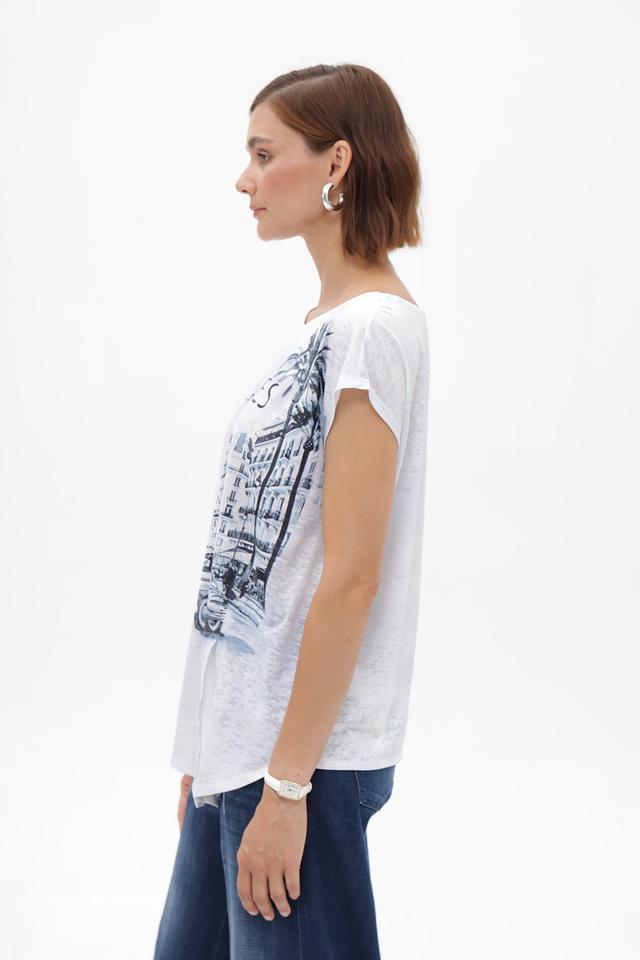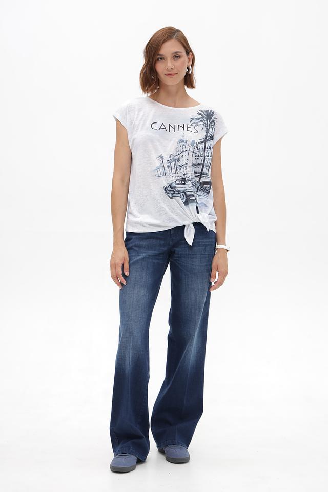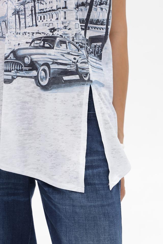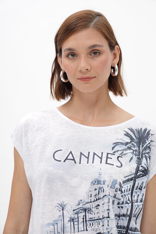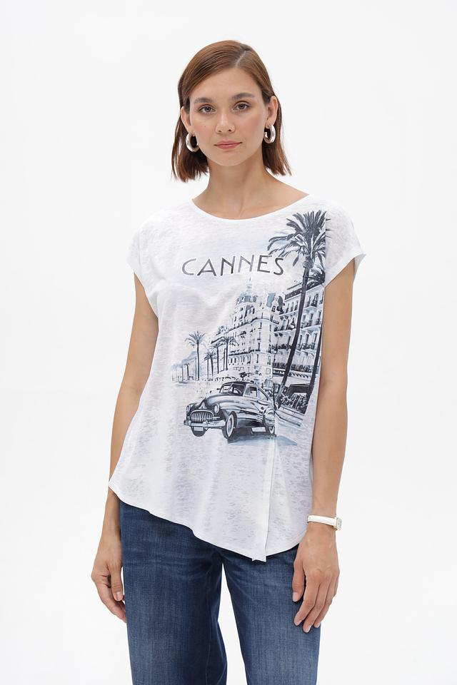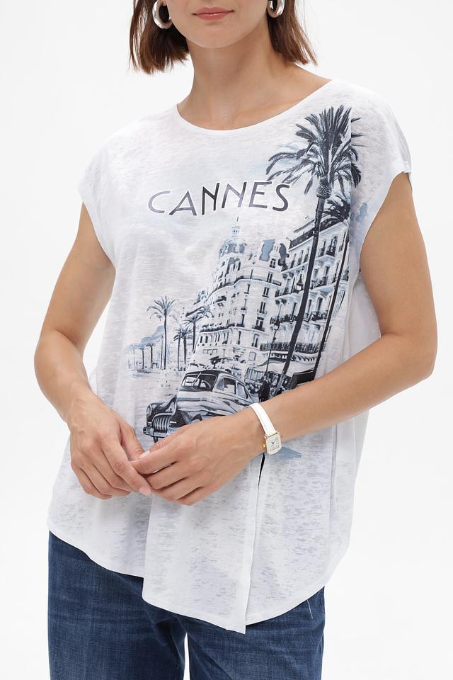 Эта футболка от Monari – идеальный выбор для создания непринужденного и стильного образа. Футболка выполнена в белом цвете и украшена эффектным принтом с изображением города Канны, что придает ей особую изысканность.
