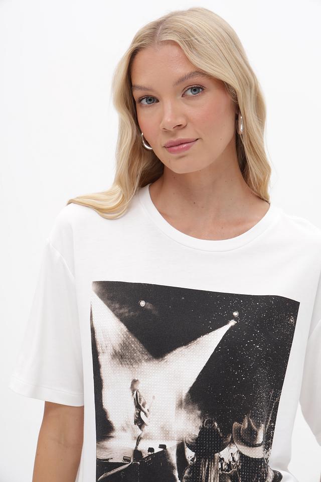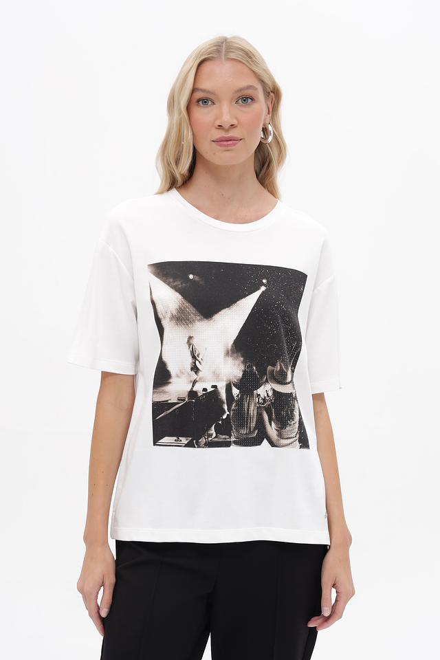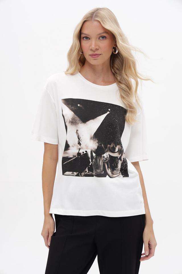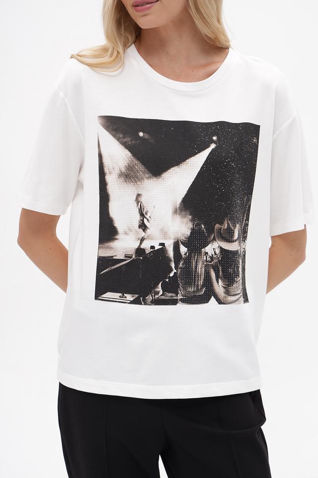 Эта футболка от Monari станет ярким акцентом в вашем гардеробе. Выполнена в белом цвете и украшена крупным чёрно-белым принтом, изображающим сцену с музыкантами и световыми эффектами.