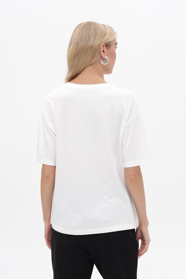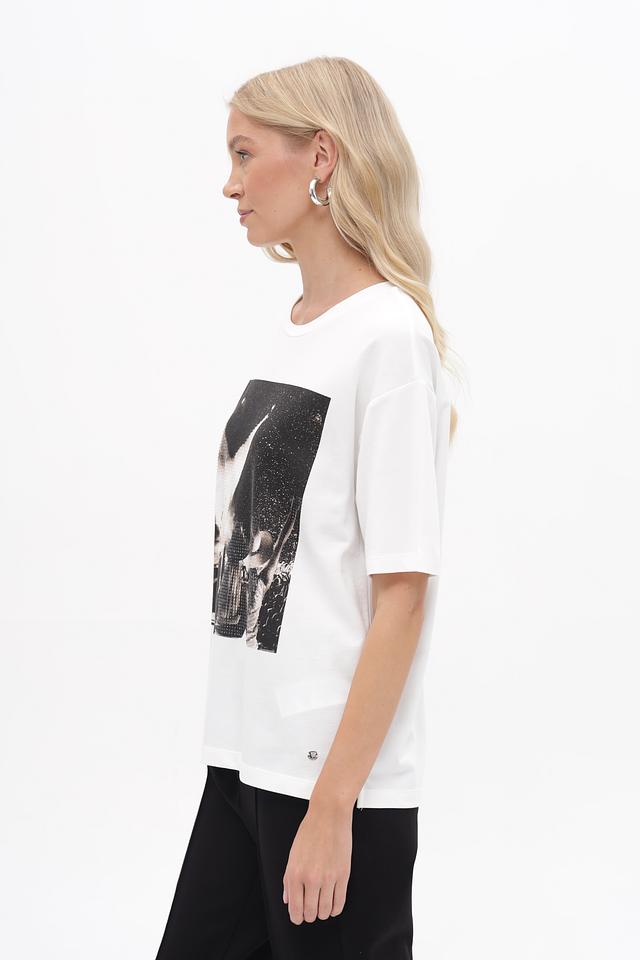 Белая футболка Monari с эффектным чёрно-белым принтом – стильное и комфортное решение для повседневного образа. Изготовлена из мягкого хлопка с модалом, обеспечивающего приятные ощущения на коже. Состав: хлопок 50%, модал 50%