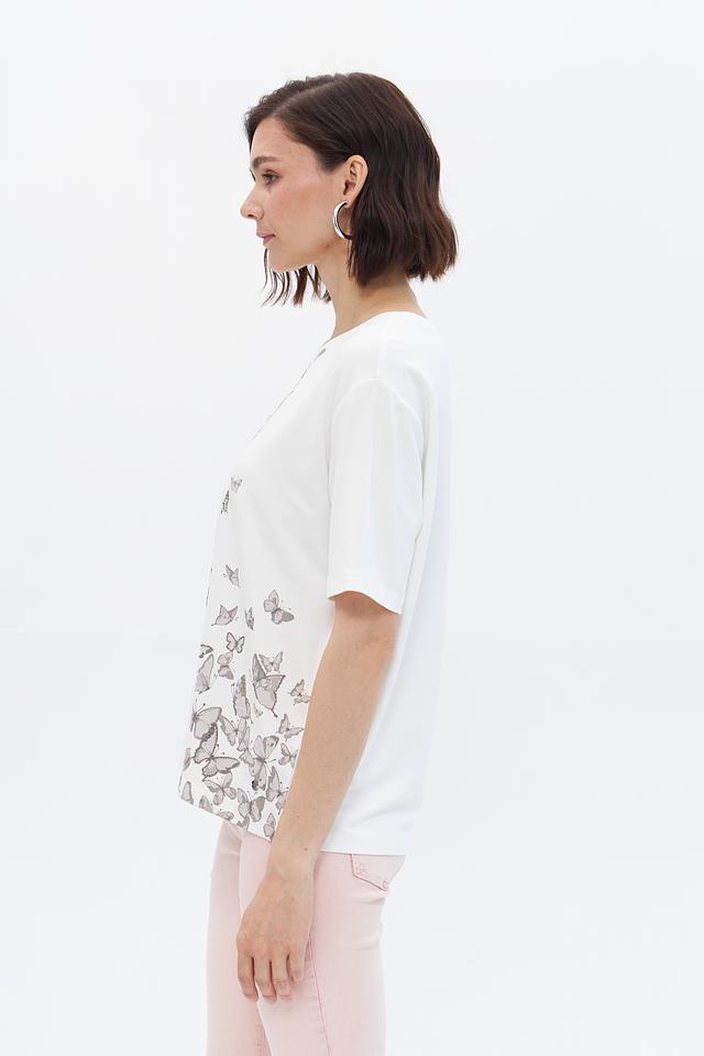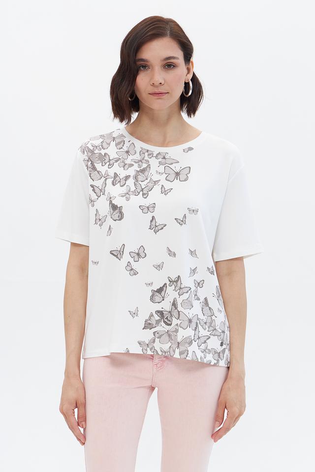 Эта стильная футболка от Monari выполнена в белом цвете и украшена изысканным принтом с изображением бабочек. Футболка имеет прямой крой и короткие рукава, что делает ее идеальным выбором для теплой погоды.