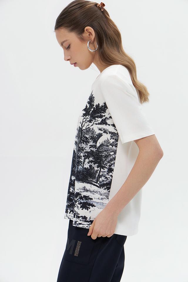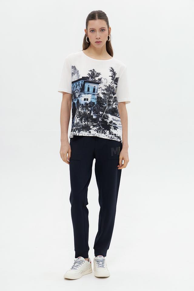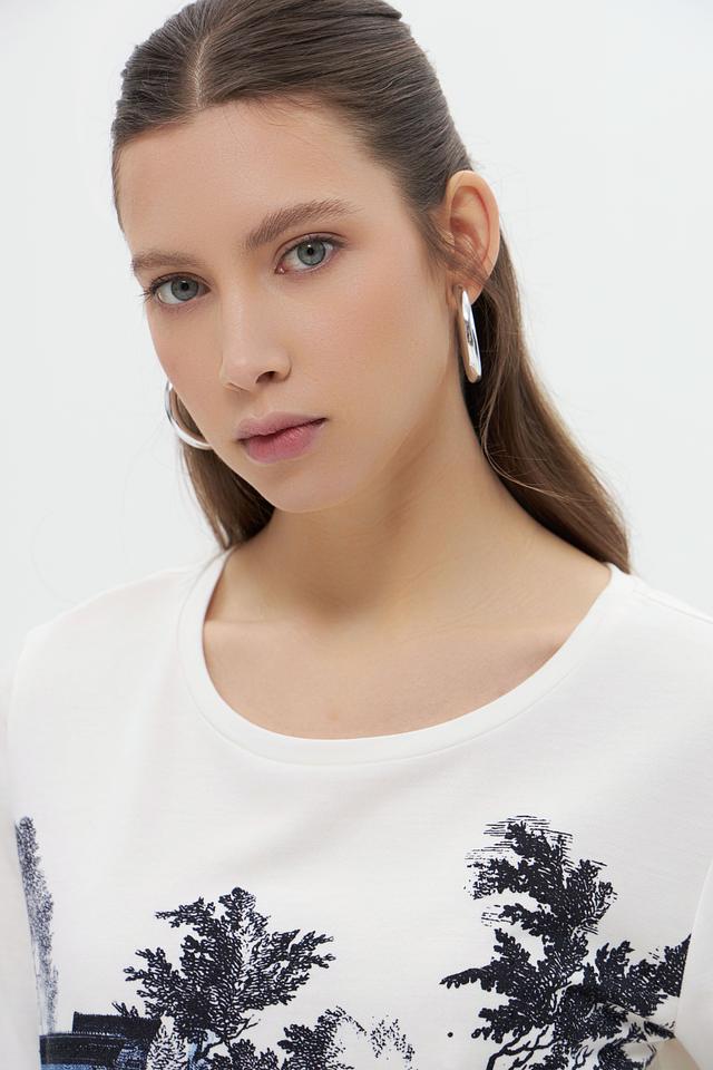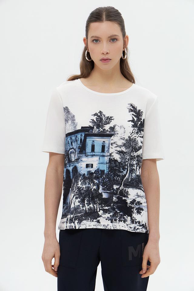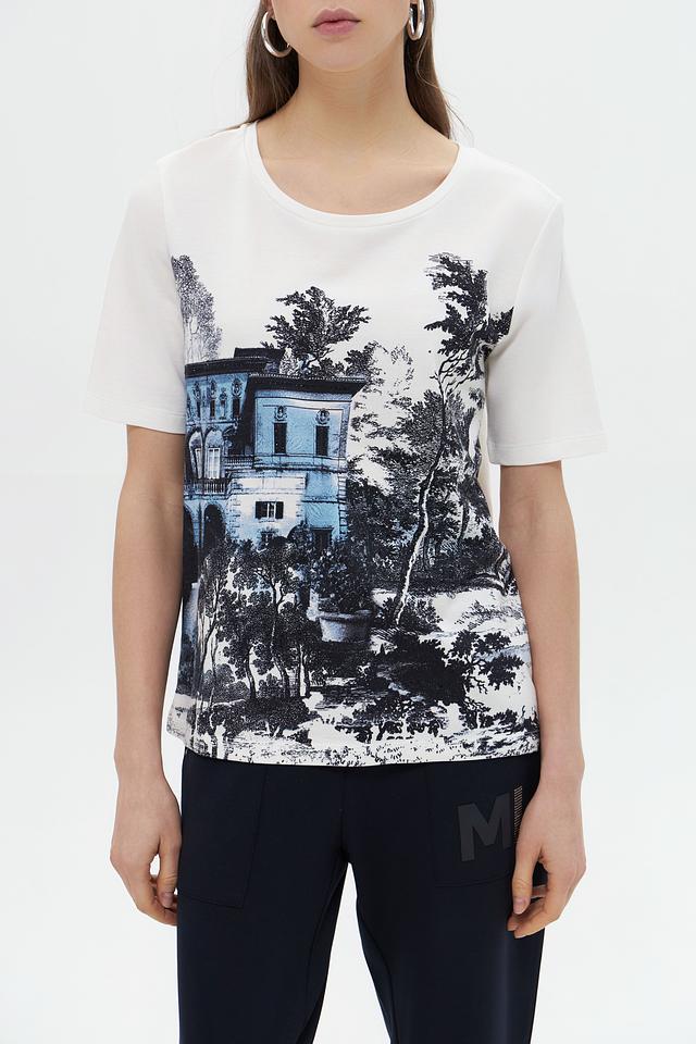 Белая футболка Monari с оригинальным принтом в виде пейзажа станет стильным дополнением к вашему гардеробу. Модель выполнена из мягкого и приятного к телу сочетания хлопка и модала, обеспечивая комфорт в течение всего дня. Состав: хлопок 50%, модал 50%
