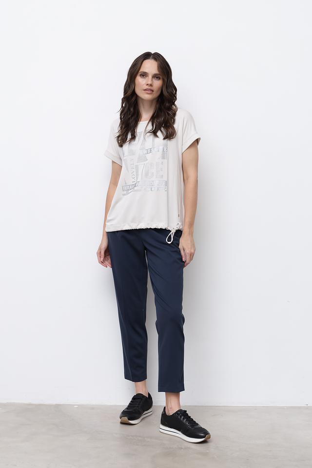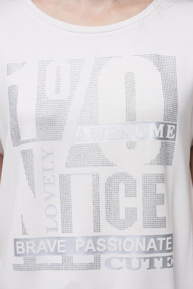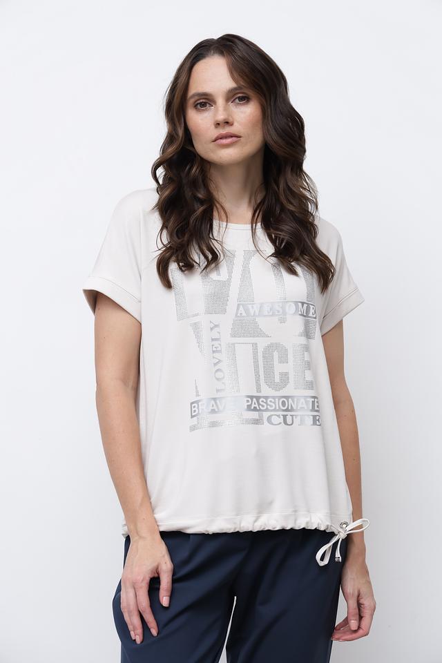 Эта стильная футболка от Monari станет отличным дополнением к вашему гардеробу. Футболка выполнена в нежном бежевом цвете и украшена эффектным принтом с надписями в сером цвете.