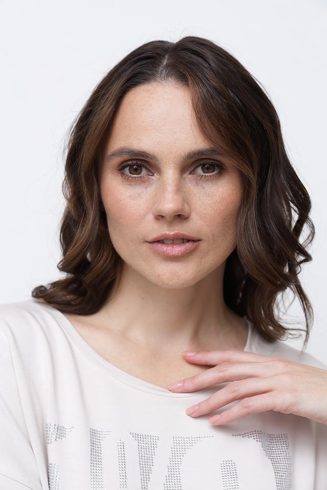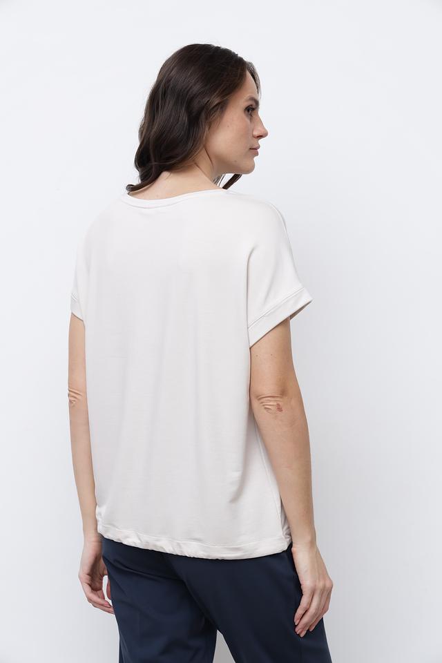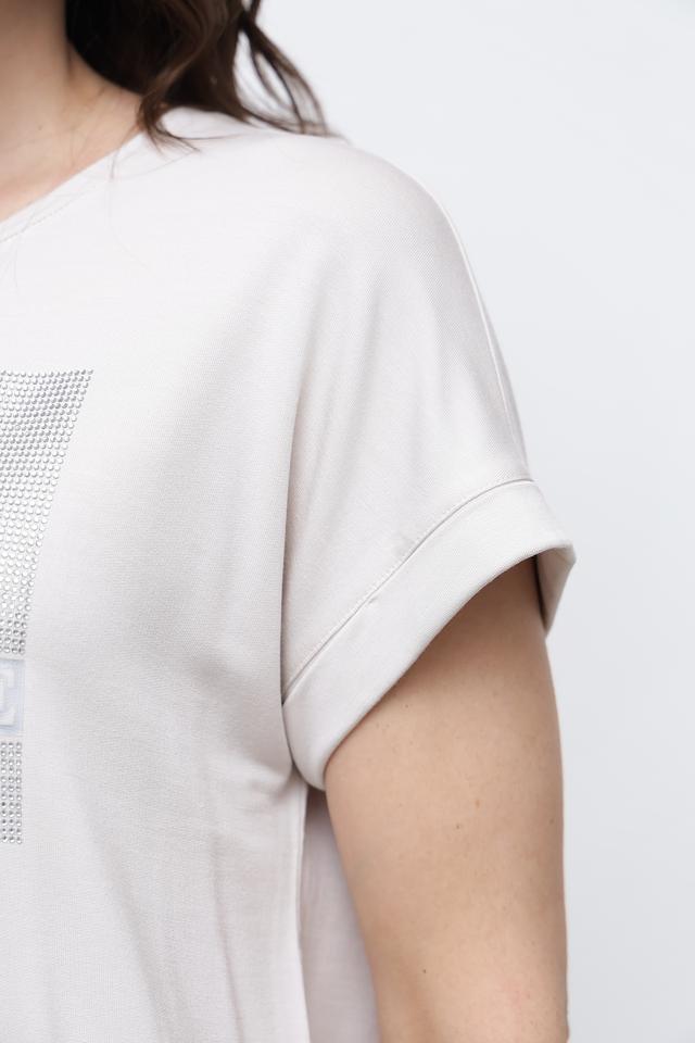 Бежевая футболка Monari с оригинальным принтом и короткими рукавами. Изготовлена из мягкой вискозы с добавлением модала и эластана, обеспечивающих комфорт и хорошую посадку по фигуре. Состав: вискоза 45%, модал 45%, эластан 10%