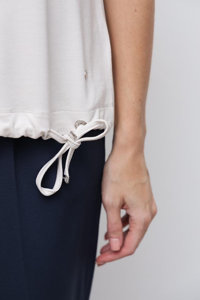 Модель имеет свободный крой, короткие рукава с небольшим подворотом и круглый вырез горловины. Сбоку на подоле предусмотрена кулиска с белыми шнурками, позволяющая регулировать силуэт.