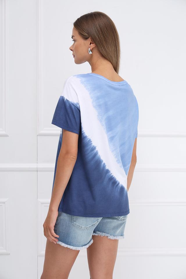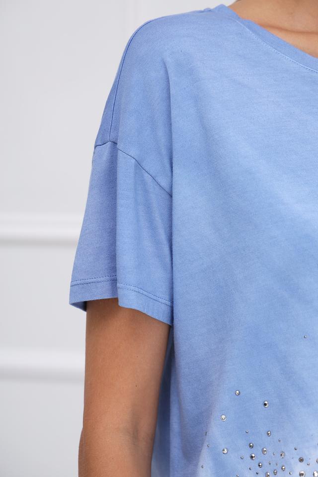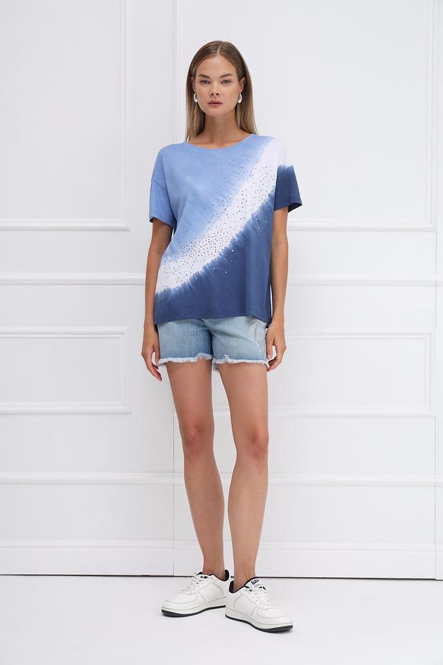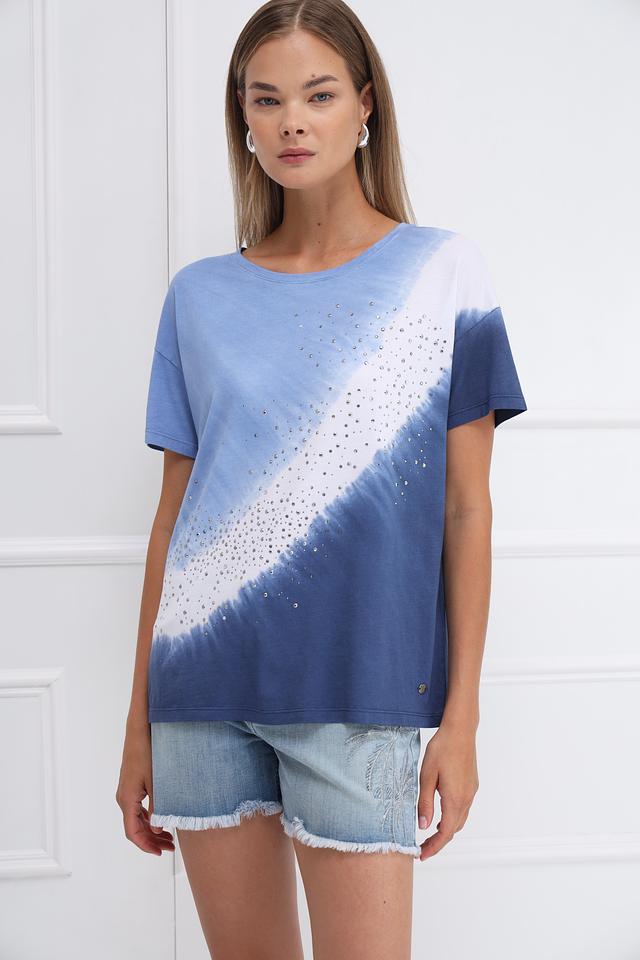 Женская футболка Monari голубого цвета в технике tie-dye, украшена кристаллами. Модель свободного кроя с короткими рукавами, выполнена из мягкого хлопка с модалом. Состав: хлопок 50%, модал 50%