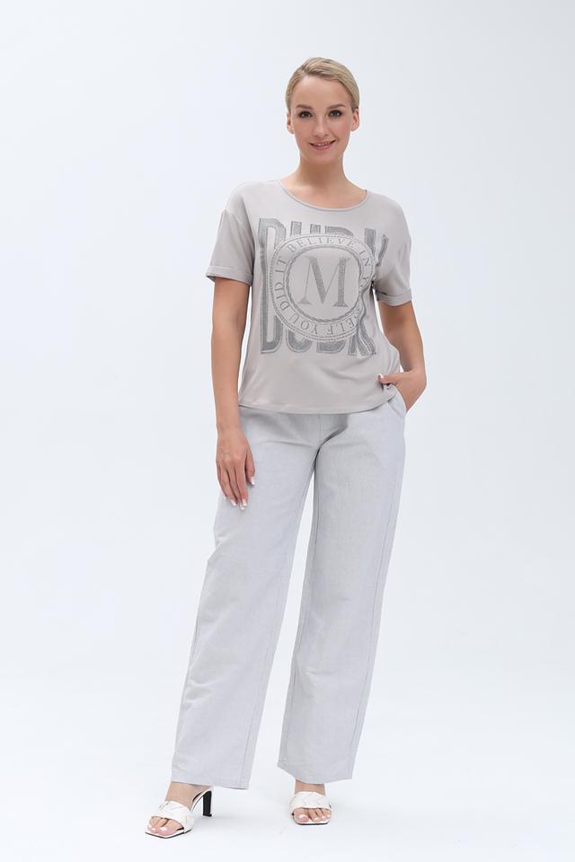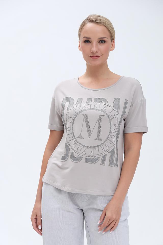 Серая футболка Monari с оригинальным принтом в виде логотипа бренда. Изготовлена из мягкой и приятной к телу ткани с добавлением вискозы и модала, обеспечивающих комфорт в носке. Состав: вискоза 45%, модал 45%, эластан 10%