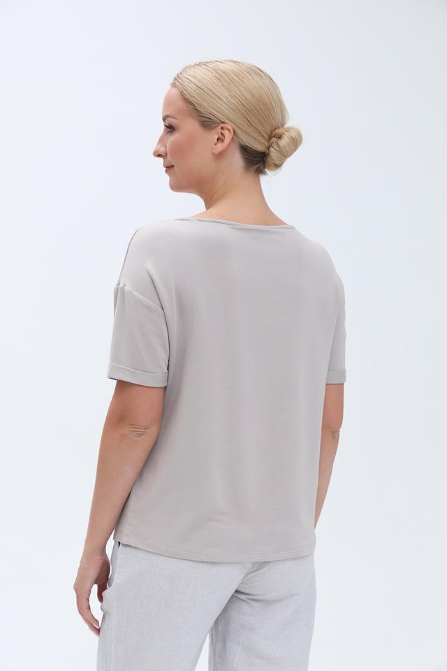 Модель имеет прямой крой, короткие рукава с небольшим отворотом и круглый вырез горловины. Ткань, состоящая из вискозы, модала и эластана, обеспечивает комфорт и свободу движений. Благодаря эластану футболка хорошо держит форму и не мнется.