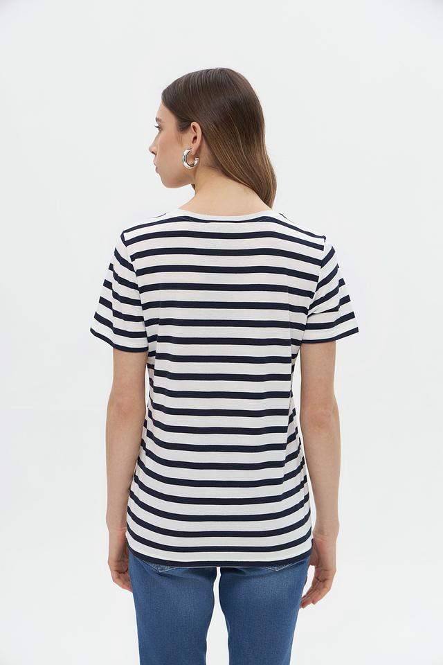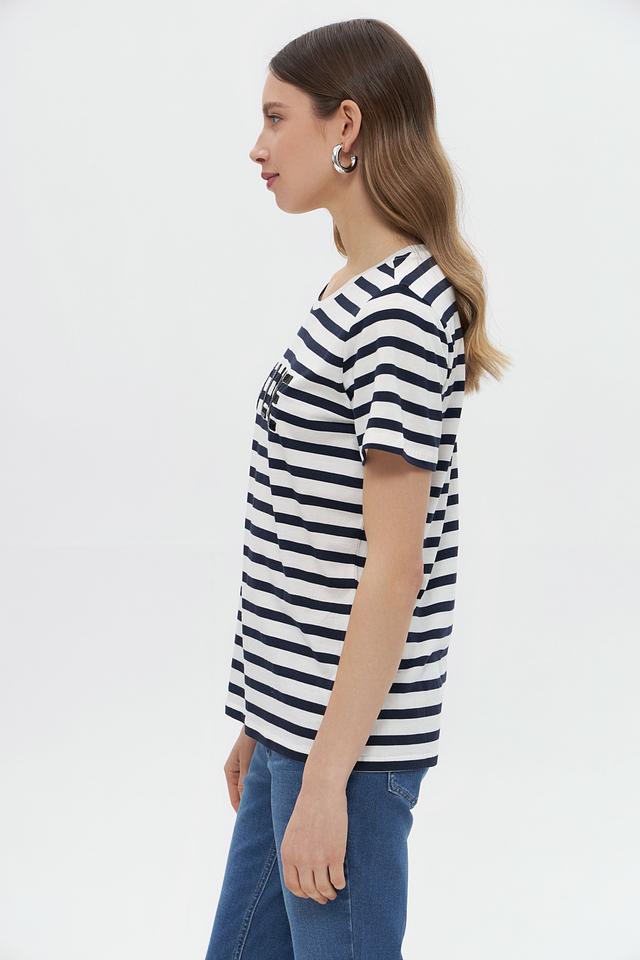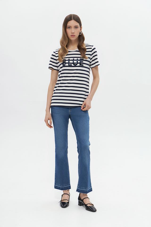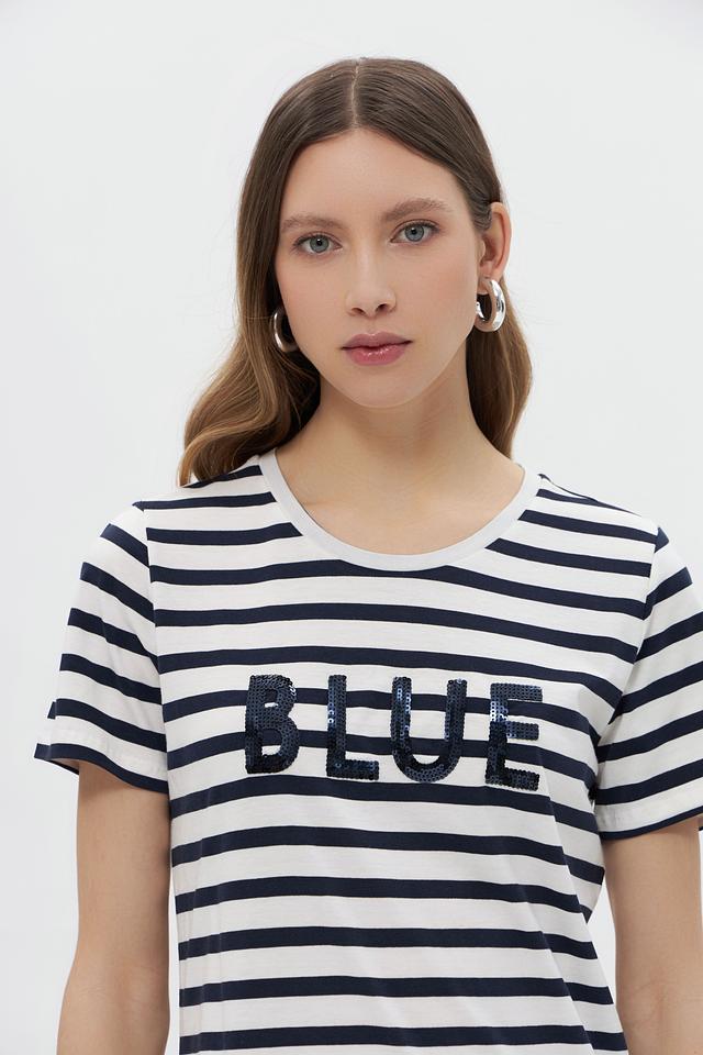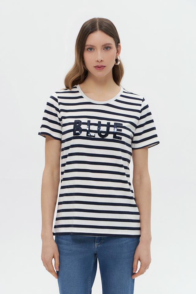 Женская футболка More and More синего и белого цвета с полоской и надписью "BLUE". Модель выполнена из мягкого хлопка с модалом, обеспечивающего комфорт в носке. Идеально подходит для создания повседневных образов. Состав: хлопок 50%, модал 50%
