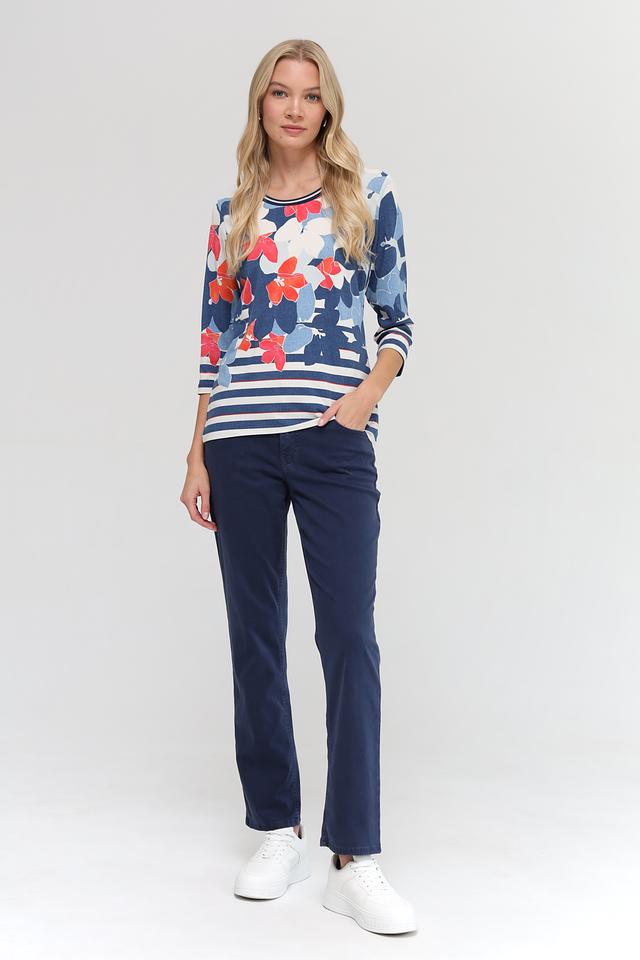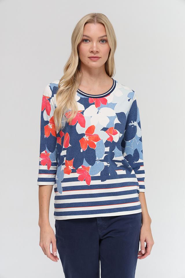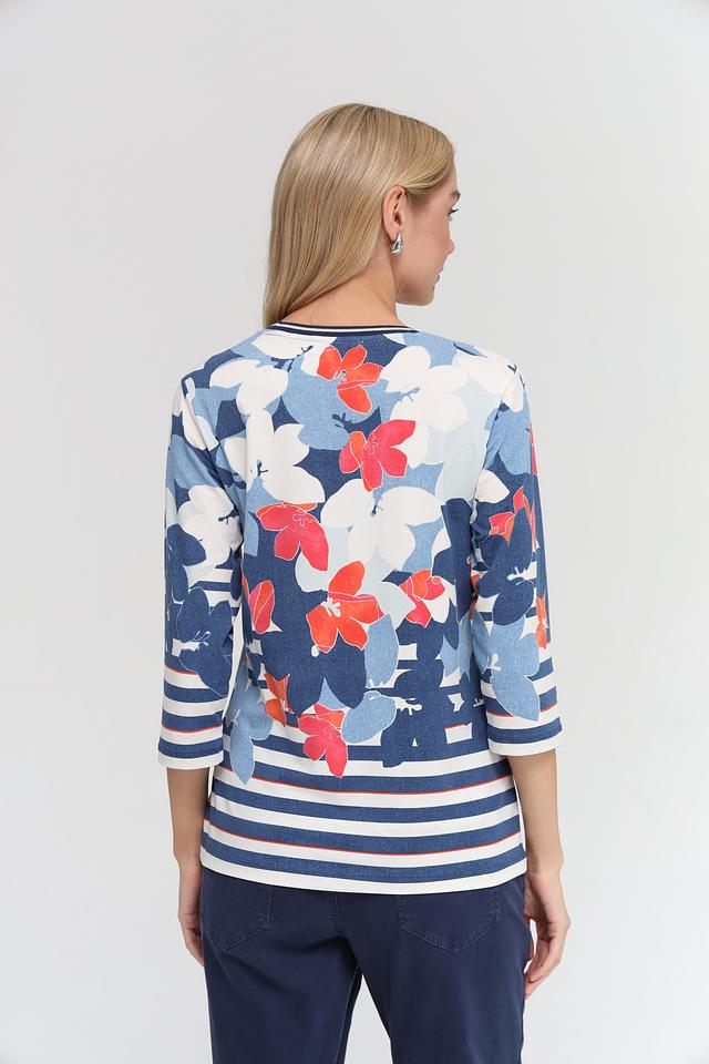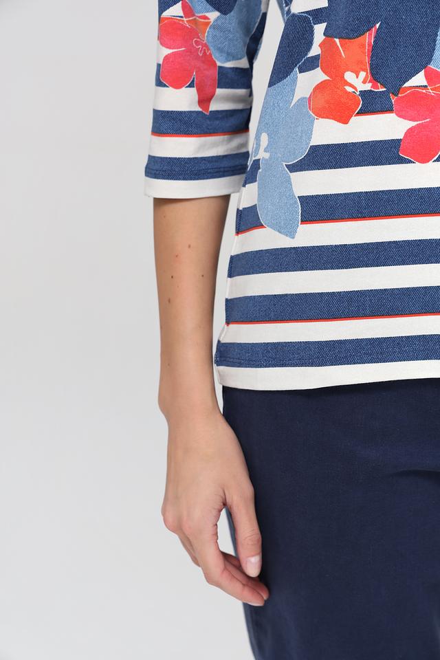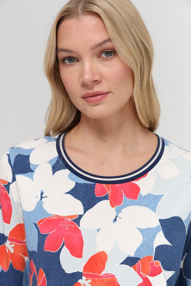 Основной цвет футболки – синий, который служит прекрасным фоном для яркого цветочного принта. Принт выполнен в сочетании красных, белых и голубых оттенков, создавая свежий и летний образ. Нижняя часть футболки украшена полоской в бело-синей гамме.