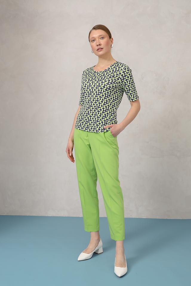 Особенностью данной модели является яркий геометрический принт, сочетающий в себе оттенки зеленого и черного на белом фоне. Футболка имеет классический крой с короткими рукавами и округлым вырезом горловины.