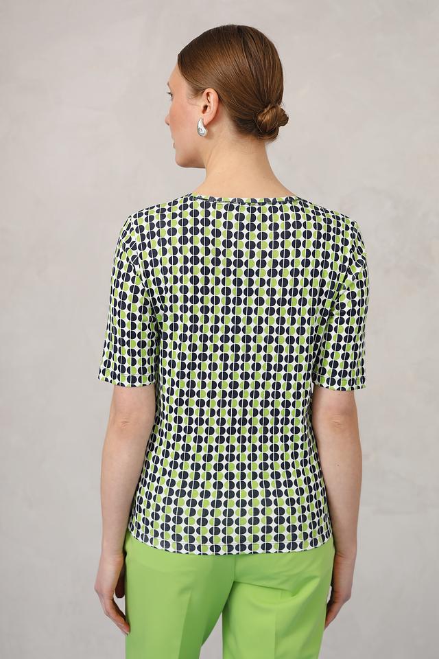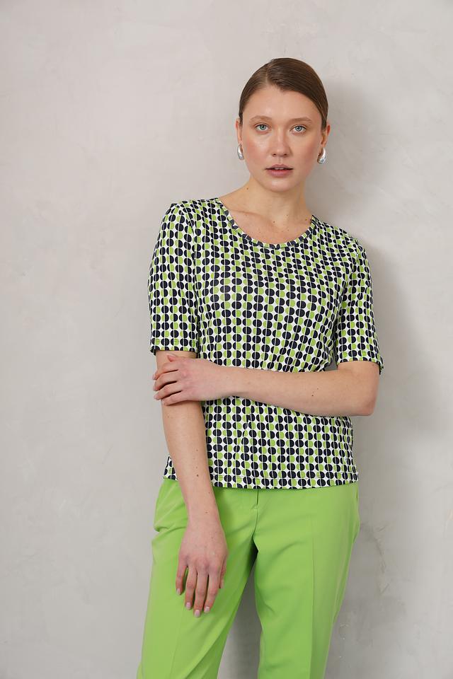 Женская футболка Olsen зеленого цвета с оригинальным геометрическим принтом. Модель выполнена из 100% хлопка, обеспечивающего комфорт и воздухопроницаемость. Футболка станет стильным дополнением к вашему образу. Состав: хлопок 100%