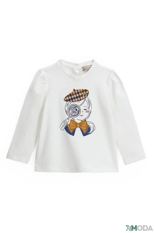 Особенностью данной модели является яркий и оригинальный принт с изображением девочки в берете и очках. Принт выполнен в нежных тонах и добавляет образу игривости и очарования.