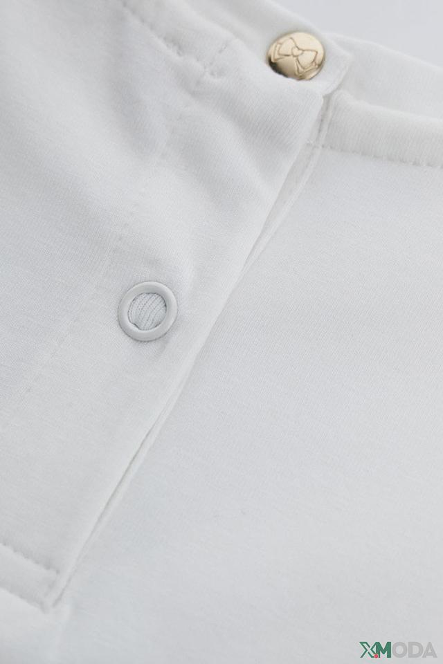 Футболка имеет длинные рукава и круглый вырез горловины, который застегивается на одну пуговицу. Рукава слегка спущены и дополнены небольшими оборками, что придает модели более женственный вид. Состав ткани обеспечивает хорошую воздухопроницаемость и легкость в уходе.