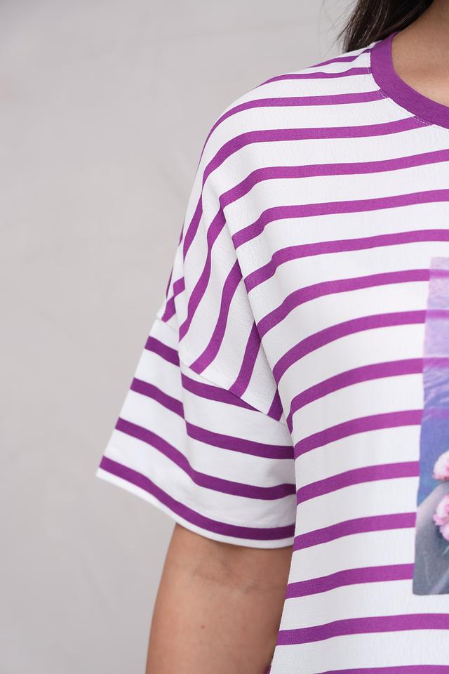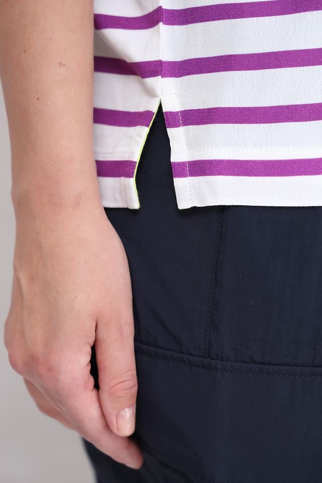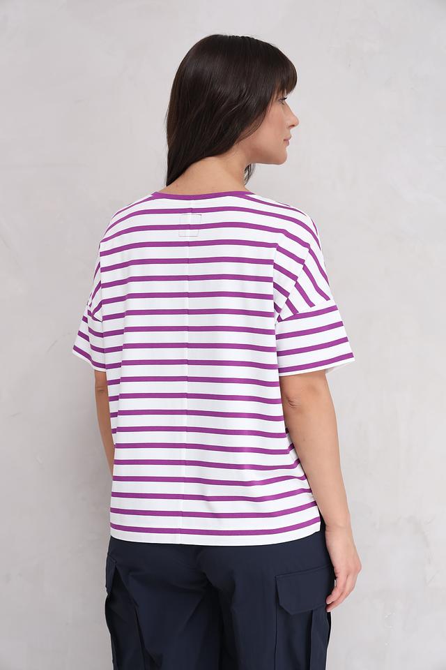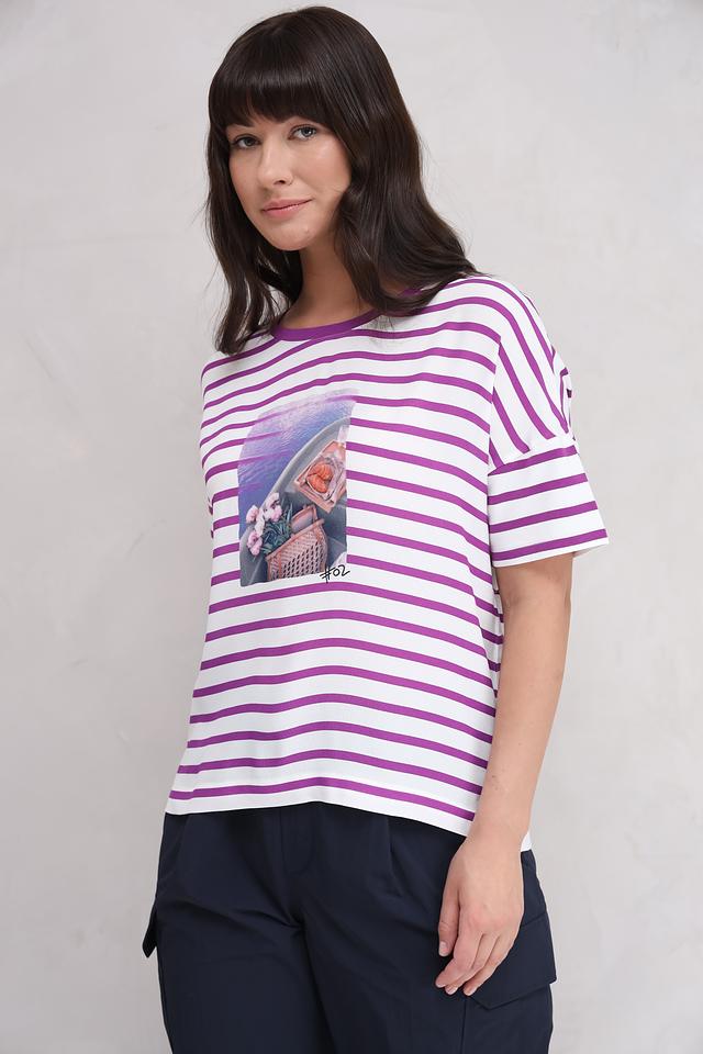 Эта стильная футболка от бренда Oui станет отличным дополнением к вашему гардеробу. Футболка выполнена в полоску, сочетающую белый и лиловый цвета, что придает ей свежий и современный вид.