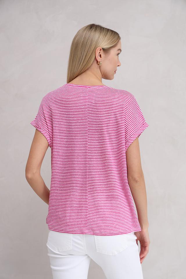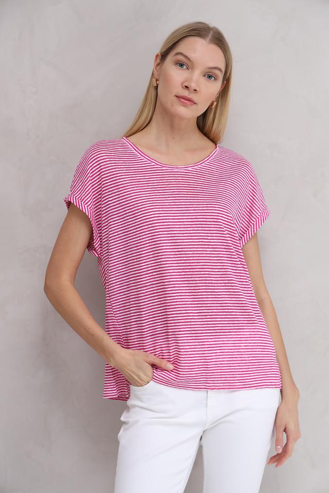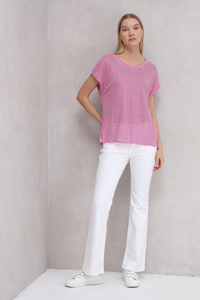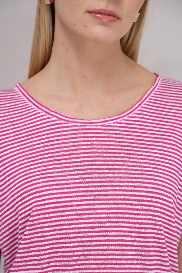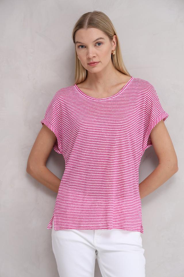 Футболка украшена классическим горизонтальным рисунком в полоску: сочетание малинового и белого цветов придает ей свежий и летний вид. Вырез горловины округлый, стандартной глубины. Короткие рукава дополнены манжетами, которые можно слегка подвернуть для создания более расслабленного стиля.