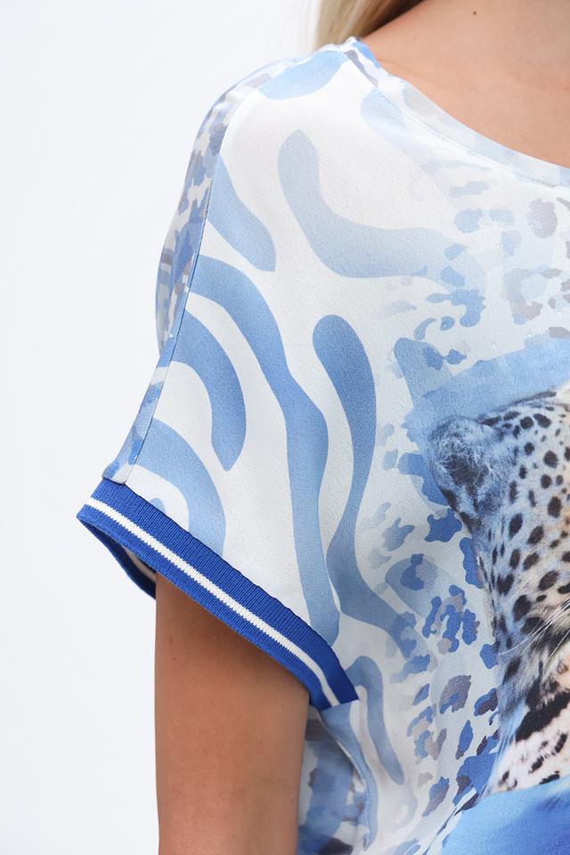 Основной цвет футболки – голубой, но она украшена ярким и красочным принтом с изображением тропических пальм, экзотических птиц и абстрактных узоров. Принт выполнен в сочетании синих, белых и голубых оттенков, создавая эффектный и запоминающийся образ.
