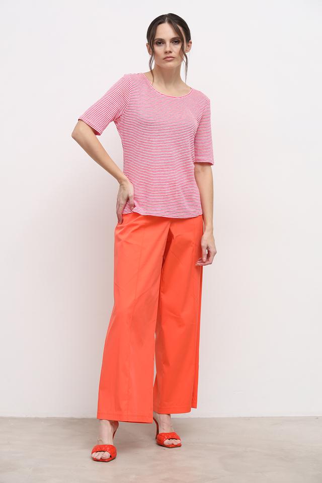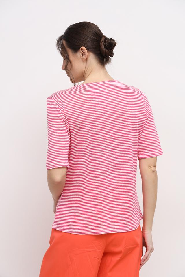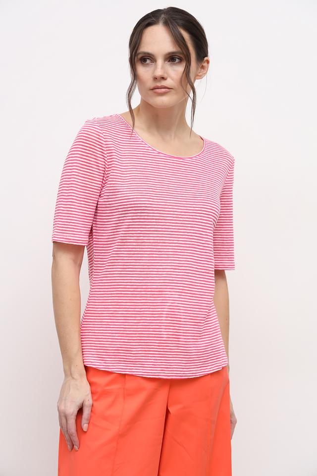 Футболка выполнена в нежно-розовом цвете с белой полоской, что придает ей свежий и легкий вид. Круглый вырез горловины подчеркивает женственность силуэта. Эта модель станет отличным дополнением к вашему летнему гардеробу.