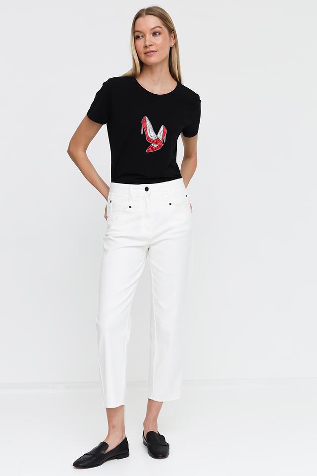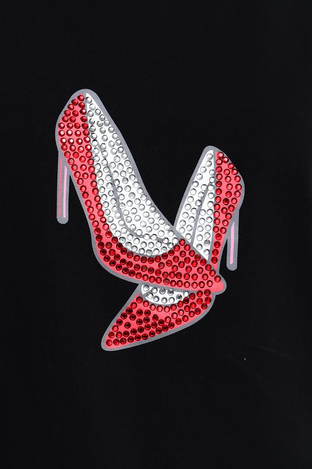 Основной цвет футболки – чёрный, который отлично сочетается с любым низом. Главная особенность модели – эффектный принт в виде красных туфель на каблуке, выполненный с использованием ярких деталей.