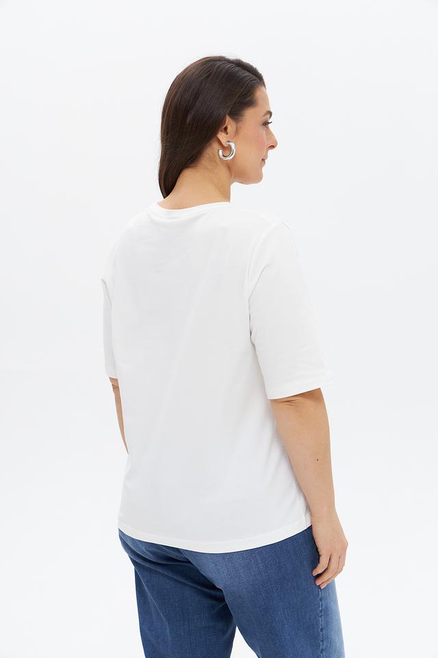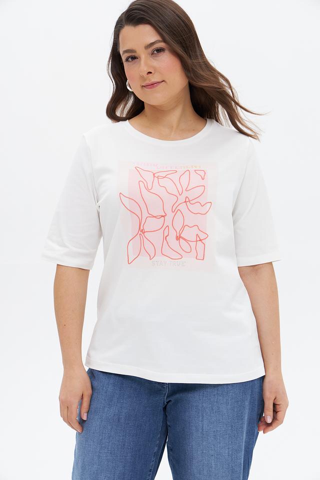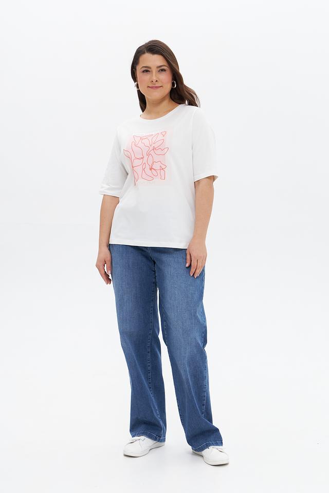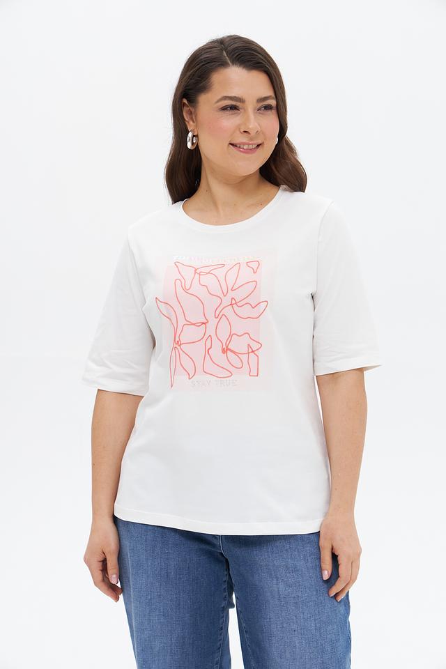 Белая футболка Rabe collection с короткими рукавами и оригинальным цветочным принтом. Изготовлена из мягкого хлопка с добавлением эластана для комфорта и хорошей посадки. Состав: хлопок 95%, эластан 5%