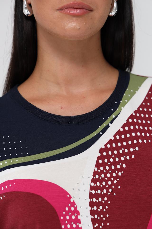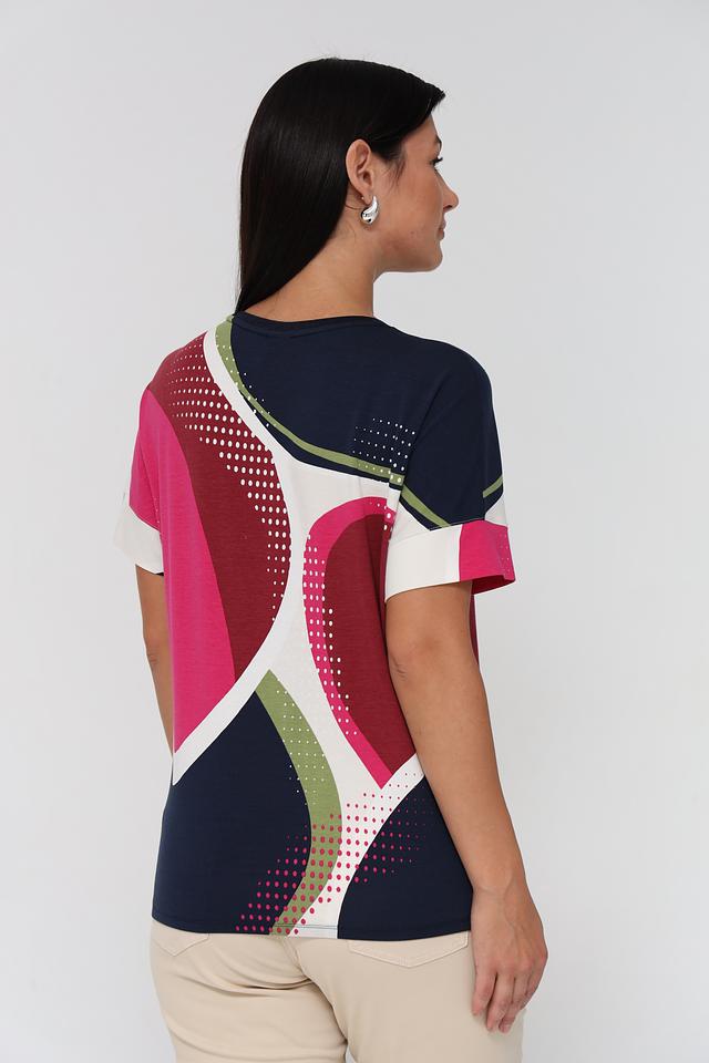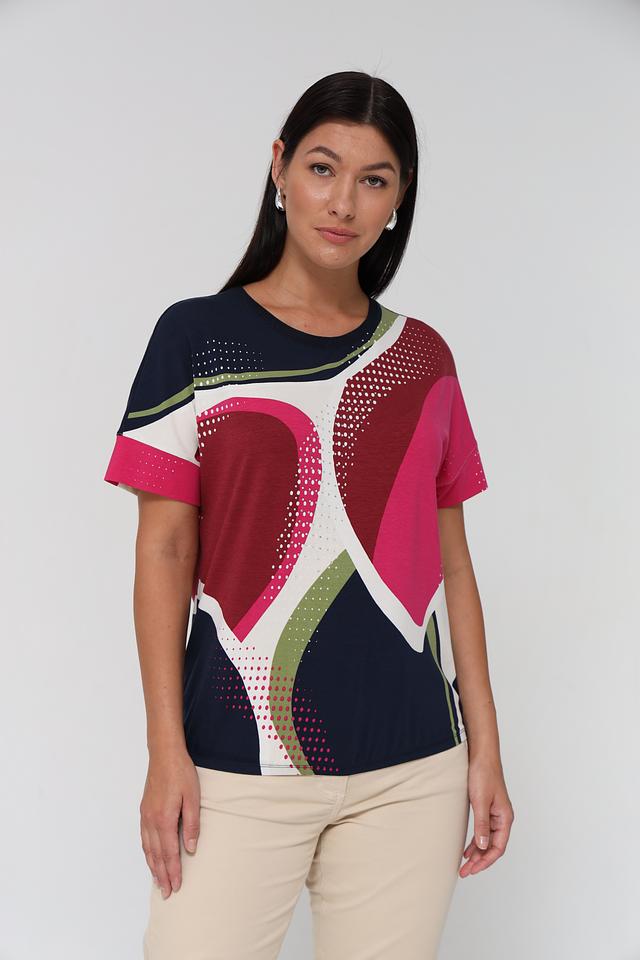 Женская футболка Rabe collection синего цвета с ярким абстрактным принтом. Модель выполнена из мягкого и приятного к телу сочетания хлопка, модала и эластана, обеспечивающего комфорт при носке. Состав: хлопок 47%, модал 47%, эластан 6%