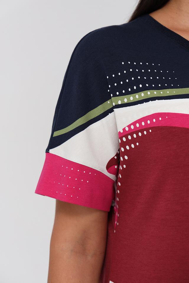 Модель имеет прямой крой и короткие рукава, что обеспечивает свободу движений и комфорт в жаркую погоду. Ткань, состоящая из 47% хлопка, 47% модала и 6% эластана, отличается мягкостью, приятностью на ощупь и хорошей износостойкостью.