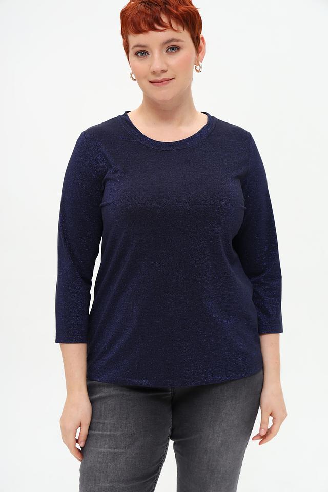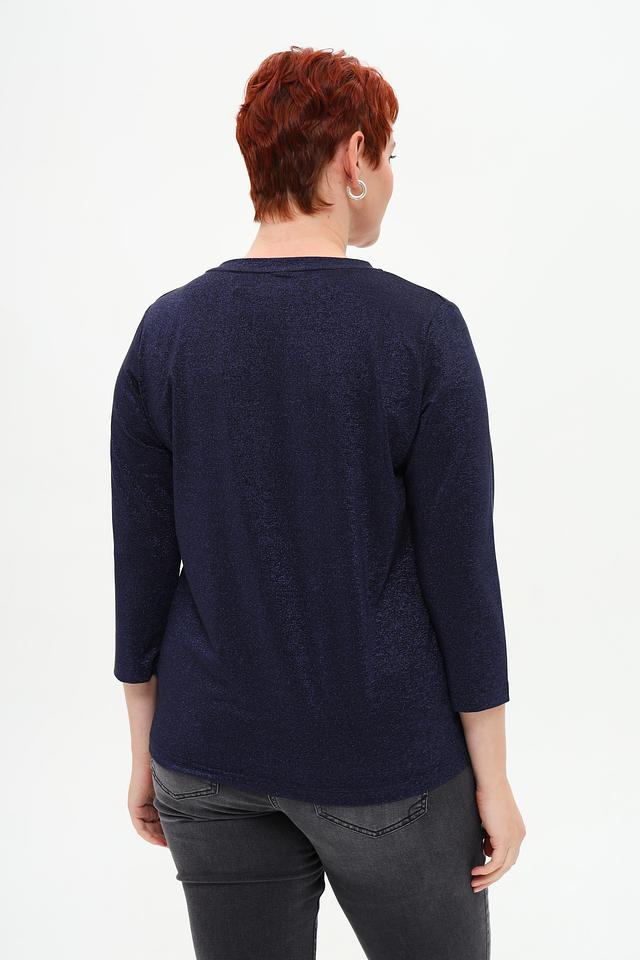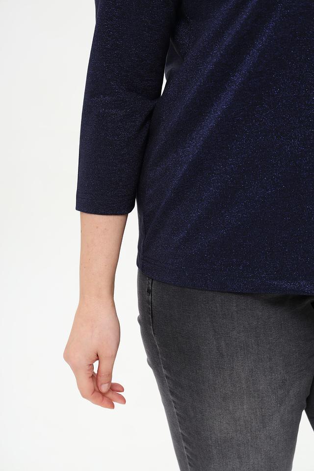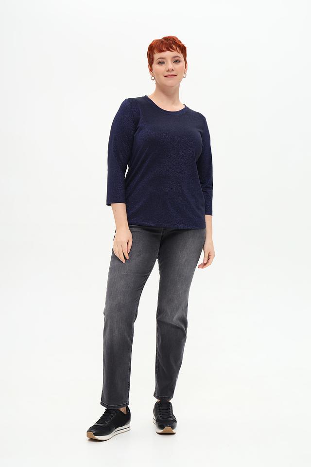 Основной цвет футболки – темно-синий, но ткань имеет деликатный блеск, который придает ей нарядный вид. Фасон футболки – прямой, с округлым вырезом горловины и рукавами длиной три четверти. Такой крой подходит для разных типов фигур и позволяет создавать разнообразные образы.