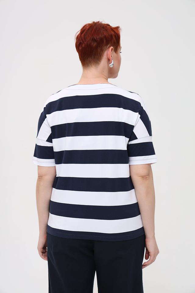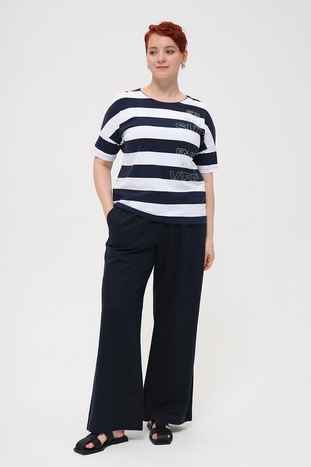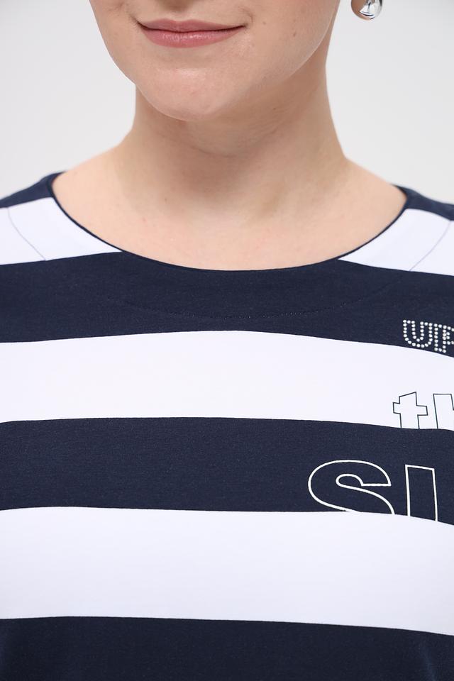 Женская футболка Rabe collection сине-белого цвета с ярким принтом и коротким рукавом. Изготовлена из мягкого хлопка с добавлением эластана для комфорта и свободы движений. Стильный и удобный вариант для повседневного образа. Состав: хлопок 92%, эластан 8%