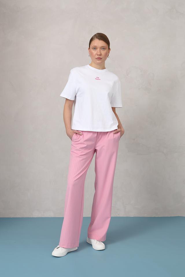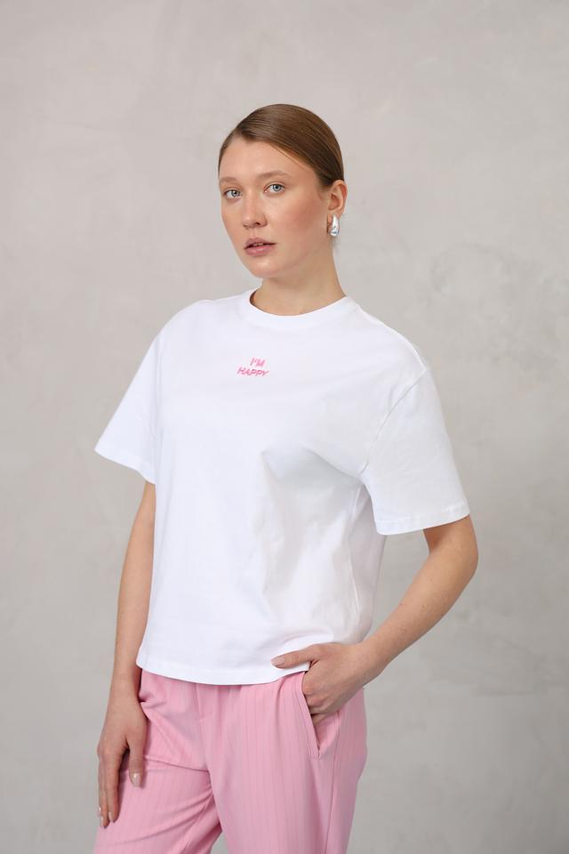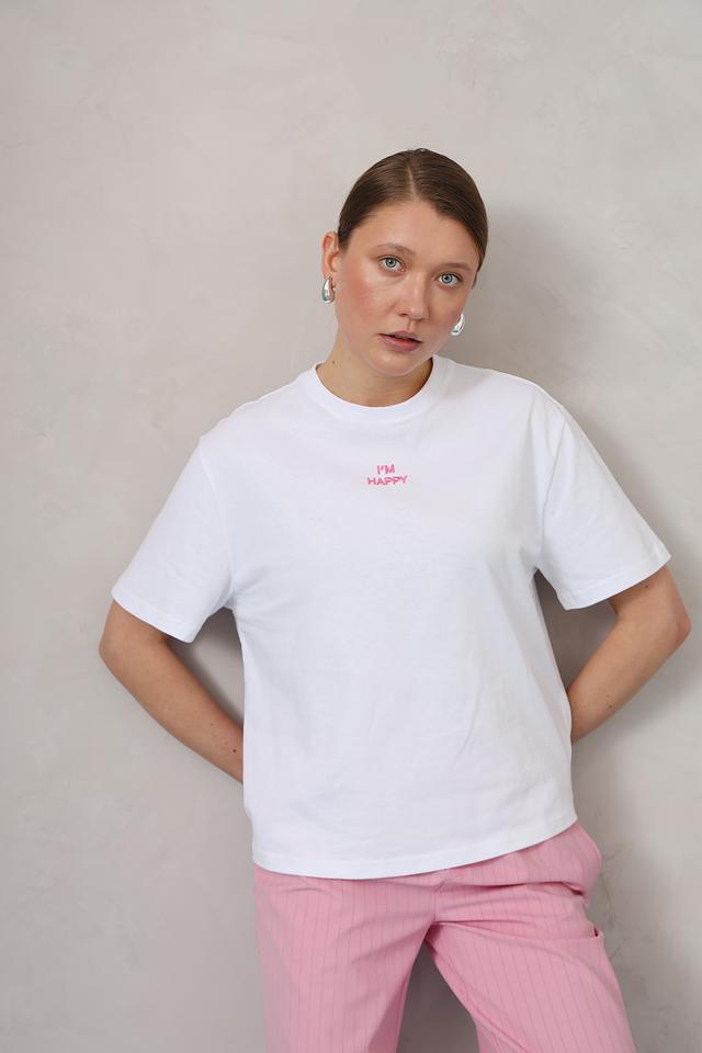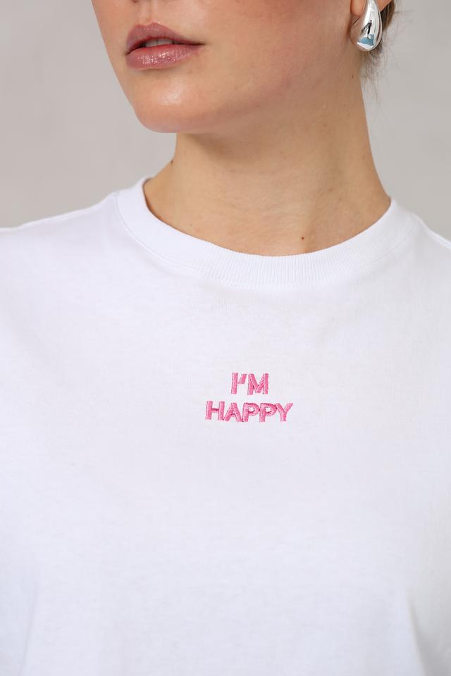 Основной цвет футболки – белый, что делает ее универсальной и легко сочетаемой с другими элементами одежды. На передней части футболки расположена небольшая, но яркая надпись "I'm Happy", выполненная в розовом цвете.