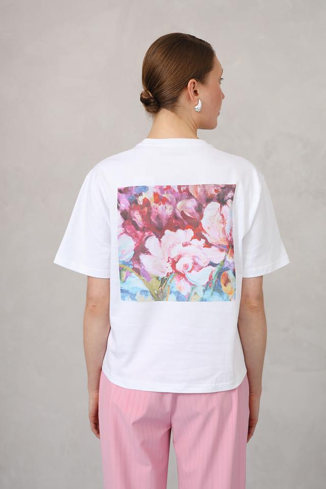 Задняя часть футболки украшена крупным, красочным цветочным принтом, который придает ей оригинальность и индивидуальность. Футболка имеет прямой крой и короткие рукава, что делает ее идеальным выбором для теплой погоды. Она прекрасно подойдет для повседневной носки, прогулок или встреч с друзьями.