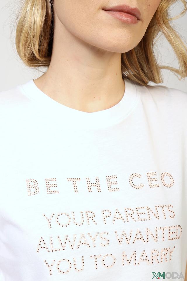 Особенностью данной модели является яркий и запоминающийся принт "BE THE CEO YOUR PARENTS ALWAYS WANTED YOU TO MARRY", выполненный в блестящем стиле. Футболка имеет классический крой и короткие рукава, что делает ее универсальной для различных образов.