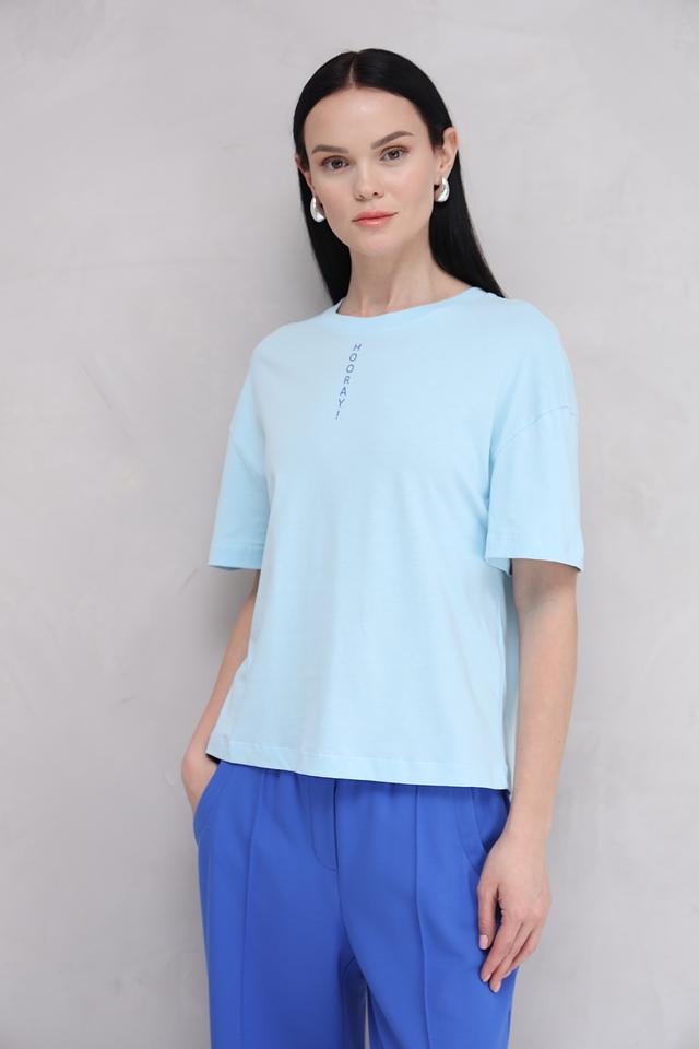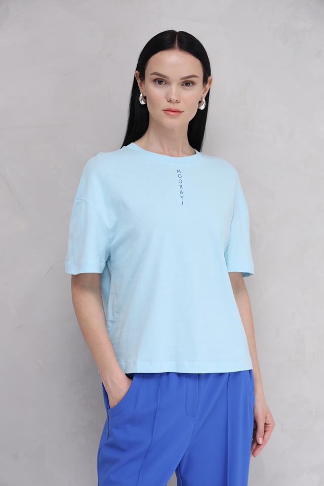 Женская футболка Rich and Royal голубого цвета с надписью "HOORAY!" на груди. Изготовлена из 100% хлопка, обеспечивающего комфорт и воздухопроницаемость. Стильный и лаконичный дизайн. Состав: хлопок 100%