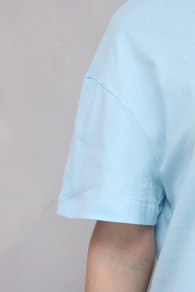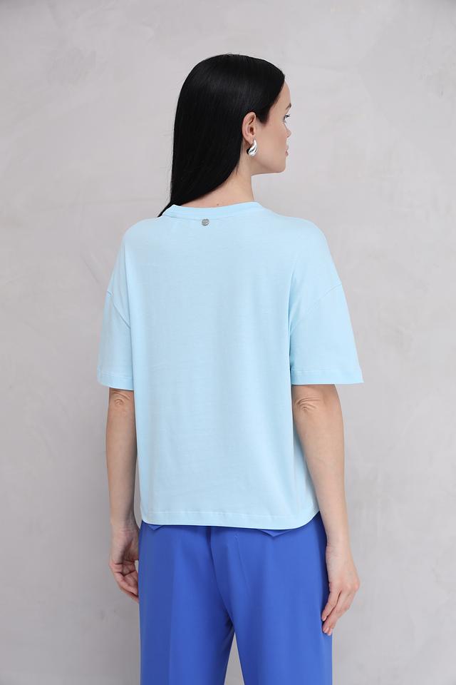 Футболка имеет прямой крой и короткие рукава, что делает ее идеальной для повседневной носки. Голубой цвет придает образу свежесть и легкость.