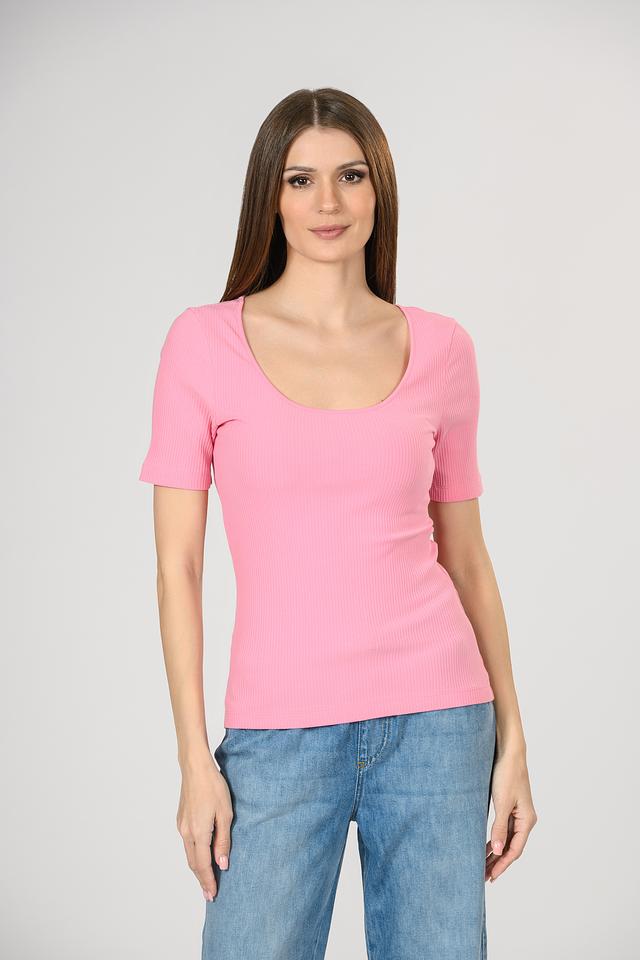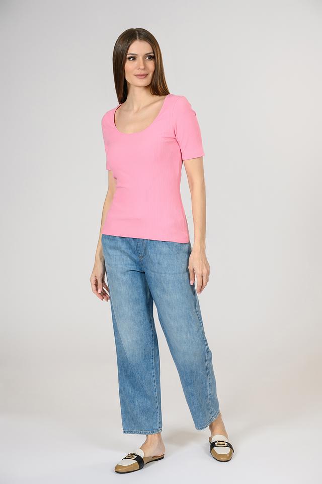Футболка имеет приталенный силуэт и короткие рукава. Ткань с вертикальной рубчатой текстурой придает модели особый шарм и визуально вытягивает фигуру. Вырез горловины округлый, не слишком глубокий.