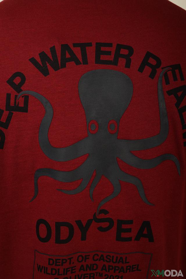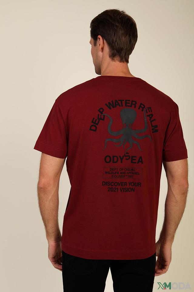 Мужская футболка s.Oliver бордового цвета с оригинальным принтом в виде осьминога. Изготовлена из 100% хлопка, обеспечивающего комфорт и воздухопроницаемость. Отличный выбор для повседневного образа. Состав: хлопок 100%